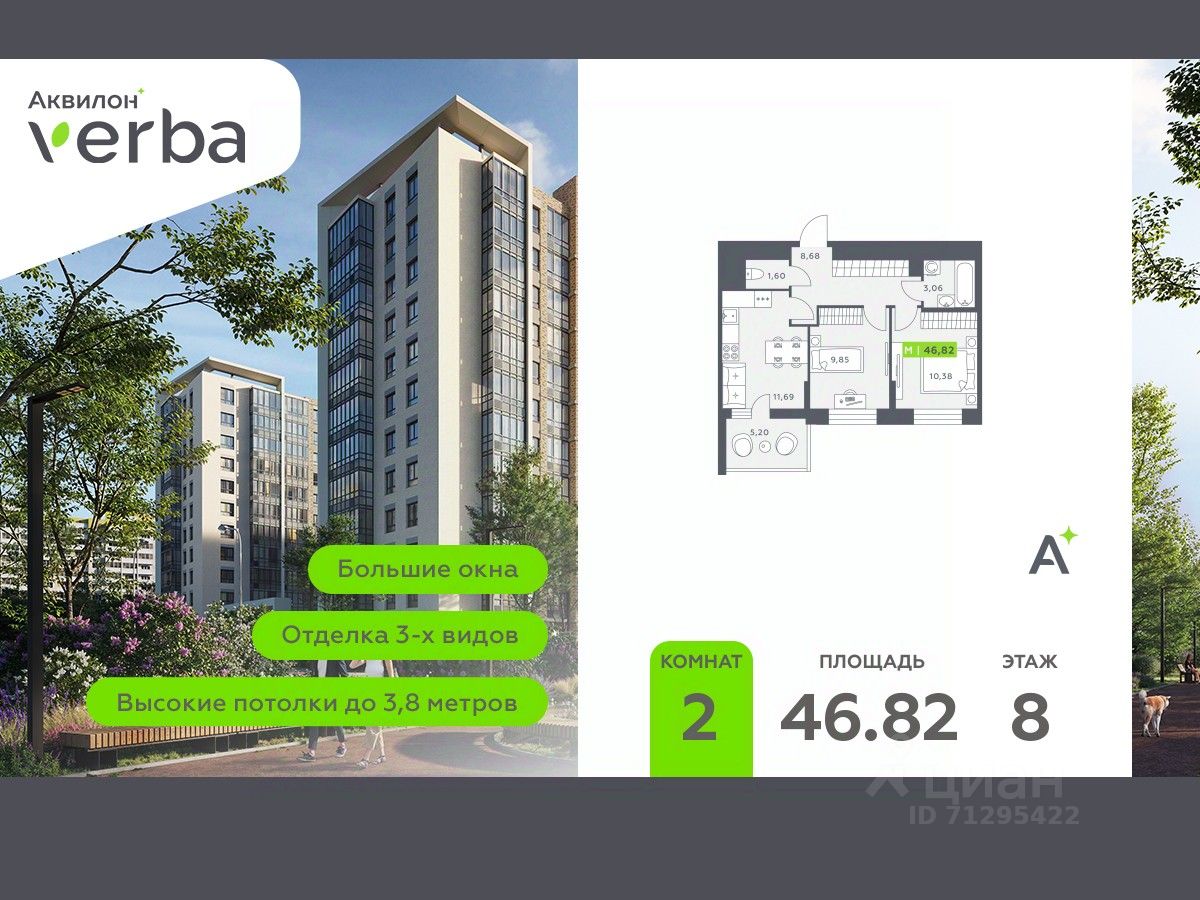 2-комн. квартира с первичной отделкой в ЖК ''Аквилон VERBA'' на 8 этаже. Общая площадь: 46.82 кв.м., жилая: 20.23 кв.м., площадь просторной кухни-столовой: 11.69 кв.м. Комнаты изолированные, все окна выходят на одну сторону. В квартире один балкон, один раздельный санузел. Высота потолков 2.72 м.
