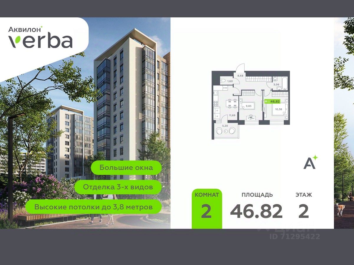 Продается 2-комн. квартира от застройщика с первичной отделкой в ЖК ''Аквилон VERBA'' на 2 этаже. Общая площадь: 46.82 кв.м., жилая: 20.23 кв.м., площадь просторной кухни-столовой: 11.69 кв.м. Комнаты изолированные, все окна выходят на одну сторону. В квартире один балкон, один раздельный санузел. Высота потолков 2.72 м.
