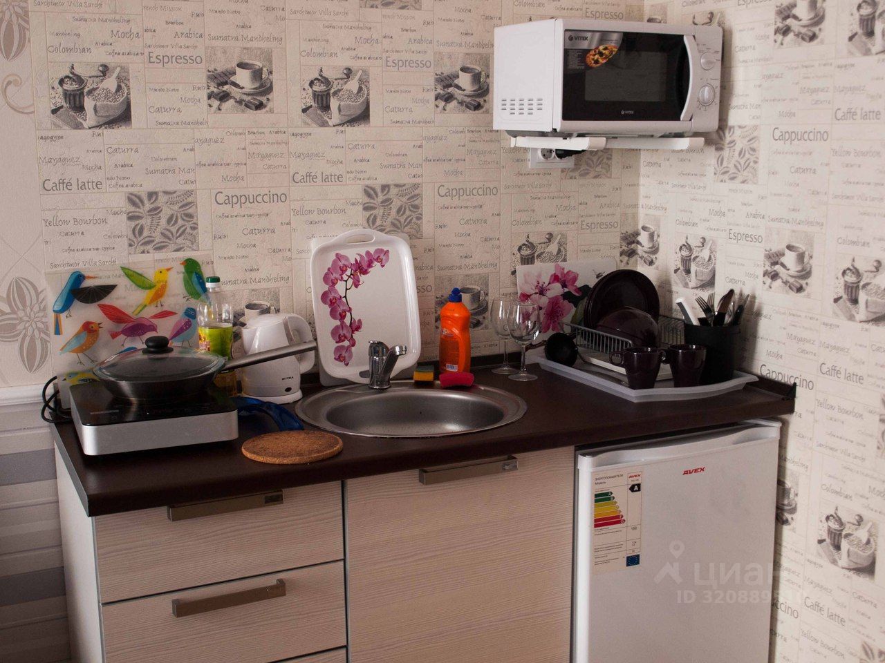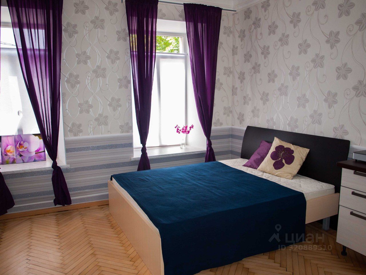 Уютная студия в фиолетовых тонах, оформленная на тему Орхидеи. Всё для комфортного отдыха: двуспальная кровать с новым матрасом, дауспальный диван, вместительный комод (плечики, полки, ящики). В кухонной зоне предусмотрено всё для удобного приготовления вкусных завтраков и ужинов: индукционная плита мгновенного разогрева, СВЧ, полноценная мойка, небольшой холодильник с морозилкой (вмещает кастрюли и сковородки). Санузел совмещенный, душевая кабина. Стиральная машина, сушилка, утюг и гладильная доска.