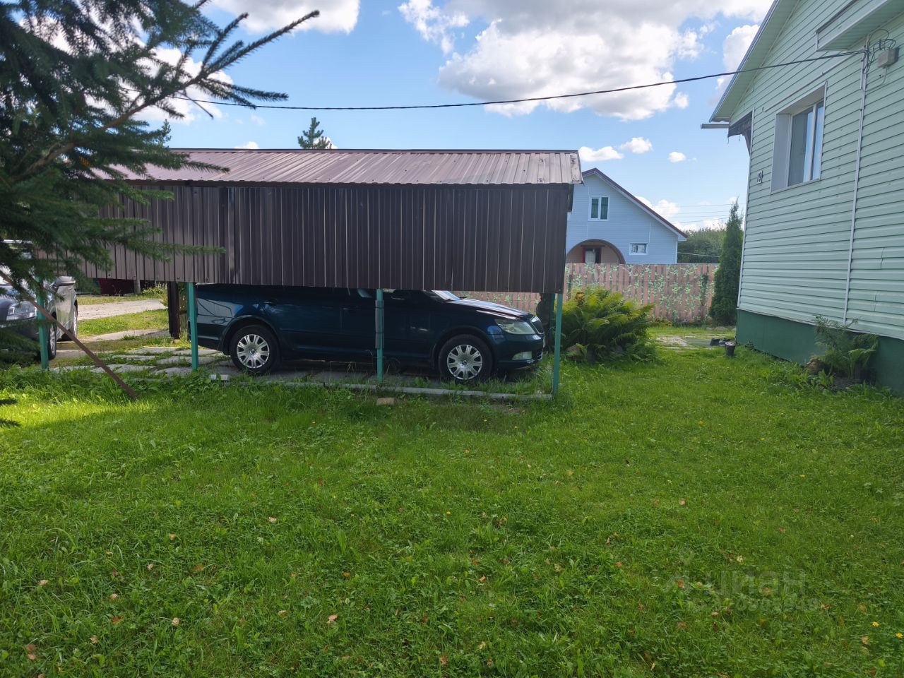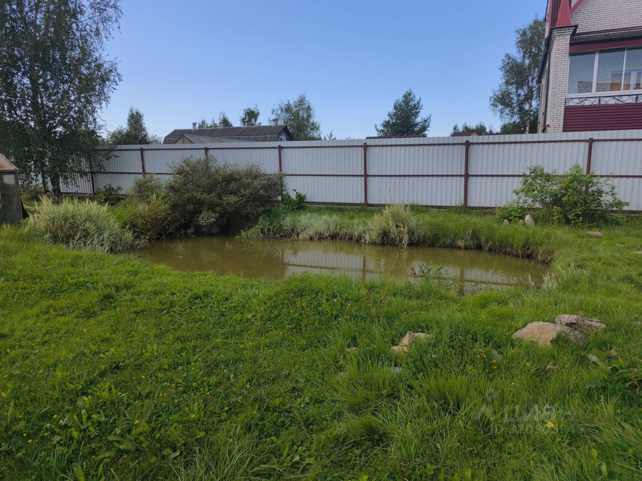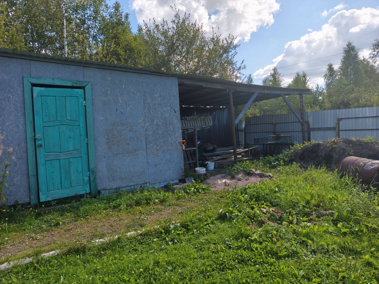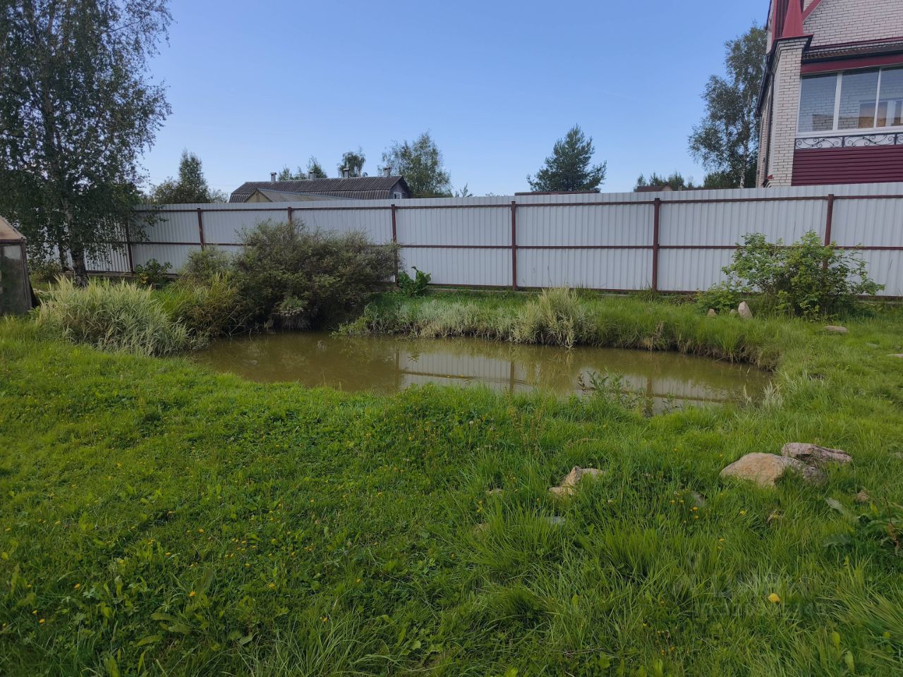 Инфраструктура участка: хозяйственные постройки, плодовые деревья, пруд, навес для машины.