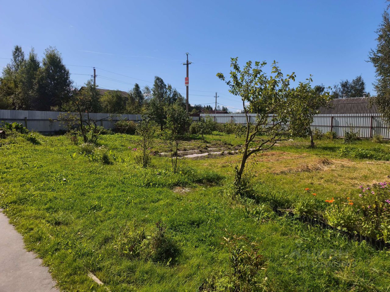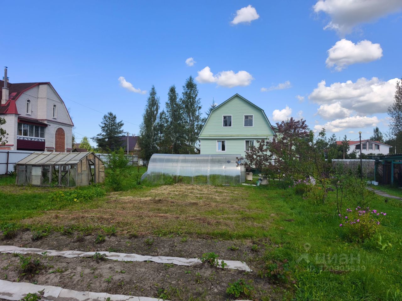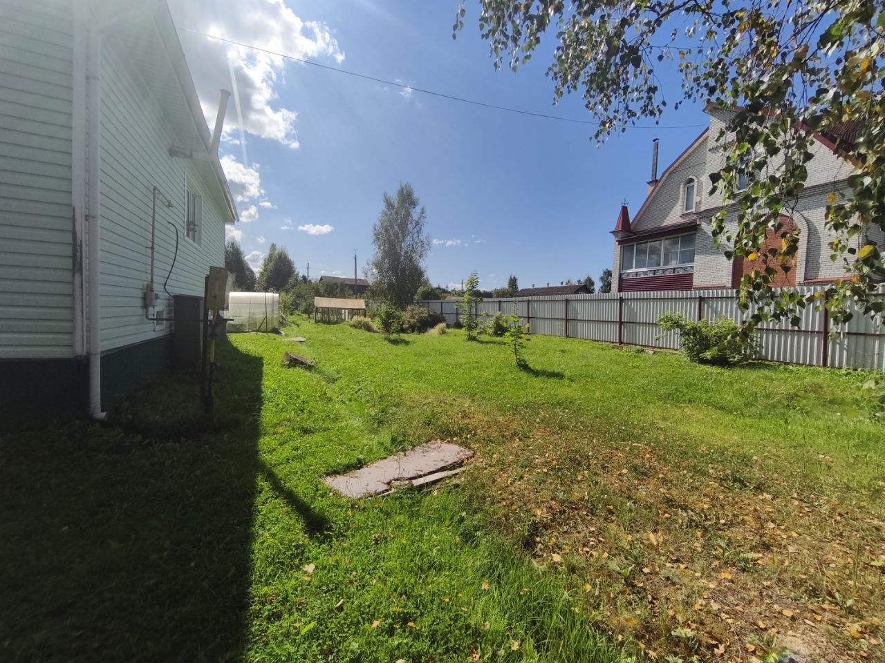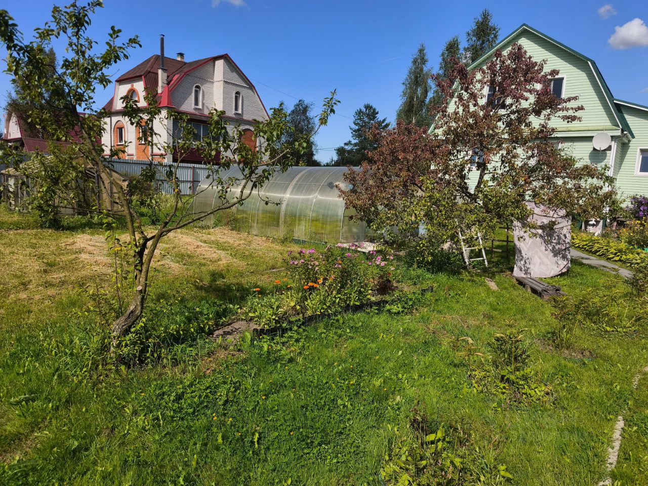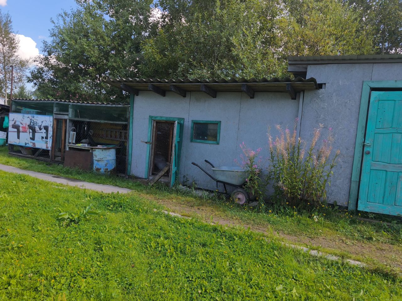 Инфраструктура участка: хозяйственные постройки, плодовые деревья, пруд, навес для машины.