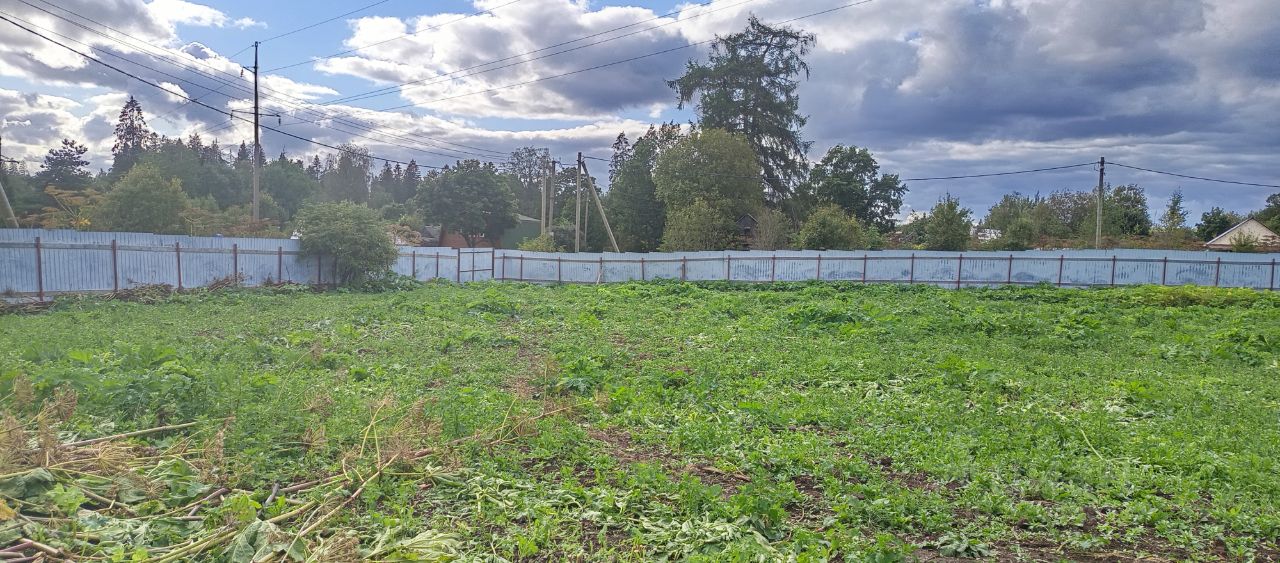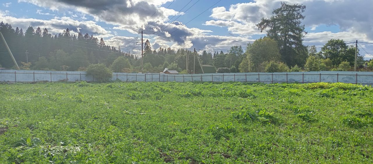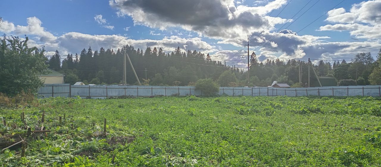 Участок имеет правильную прямоугольную форму, с трех сторон огорожен металлическим забором. Соседи только с одной стороны, рядом поле, простор и горизонт.