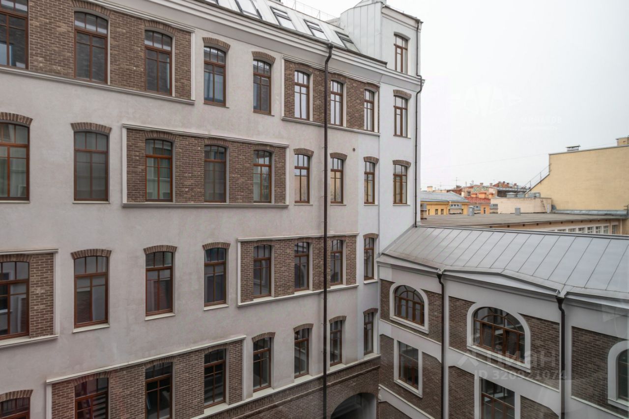Большие окна выходят в тихий двор, в сторону Галерной. Летом здесь нет жары из-за солнца, нет шума улицы - зато красивый вид на перспективу крыш и небесную линию Петербурга.