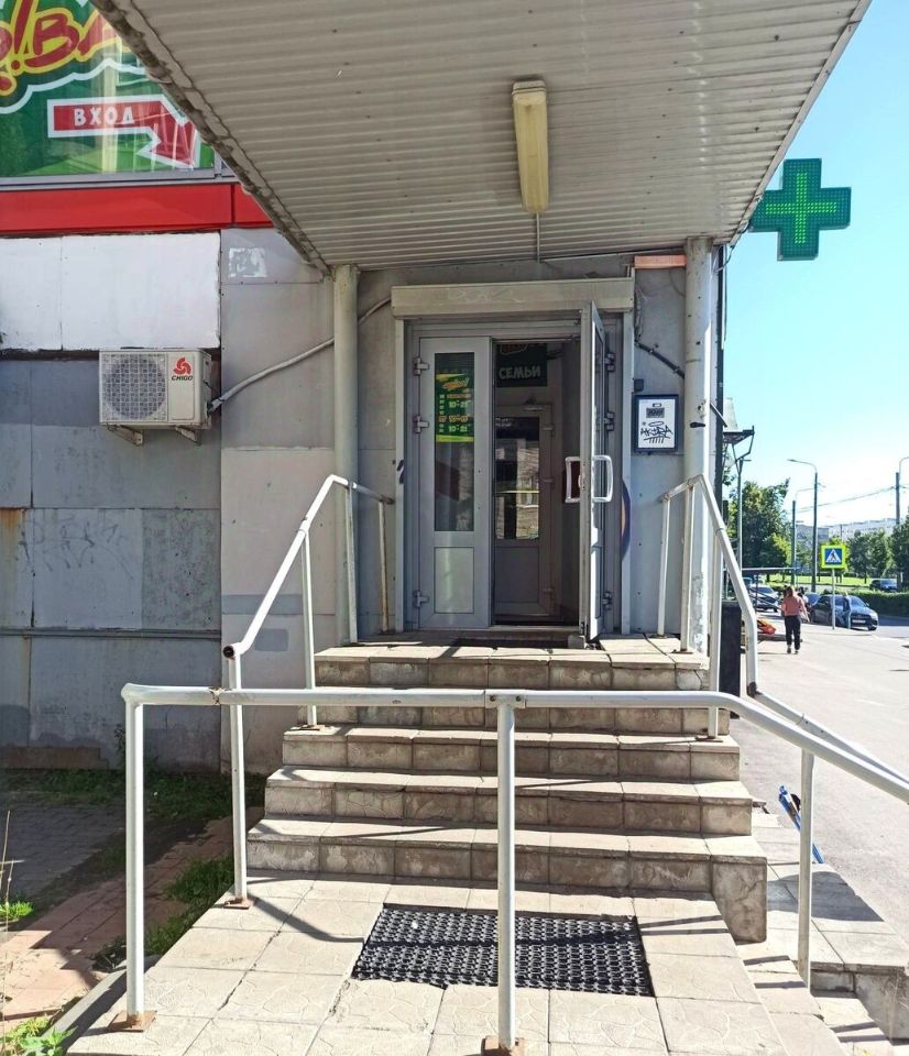 Остановка общественного транспорта и пешеходный переход перед зданием. Парковка в кармане и вокруг здания. Преимущества объекта недвижимости: -Высокая плотность жилой застройки. -Близость метро. -Вход с Проспекта Ветеранов. -Евроремонт. -Отличное состояние коммуникаций. -Отремонтированная крыша. -Витринные окна. -Место для вывески. -Окна на три стороны. -Загрузка со двора.