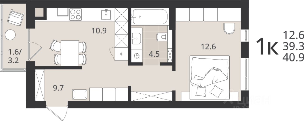 Общая площадь39,3 м2