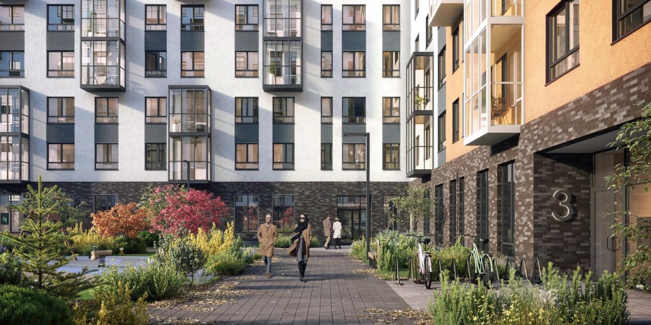 Современные монолитные дома высотой 12 этажей выполнены в нейтральной цветовой гамме с яркими акцентами.