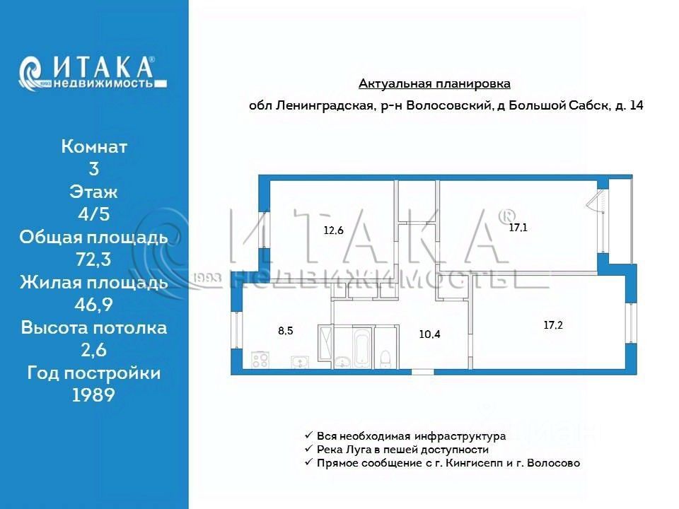 1-91945 СПб+100 км. Волосовский район, в д. Большой Сабск на реке Луга! Продается 3-х комнатная квартира на 4/5 этаже панельного дома 121 Гатчинской серии 1989 года постройки. общая площадь 72.3 м2, комнаты изолированные - 17.2 + 17.1+12.6 м2, кухня 8.5 м2. Теплая, светлая квартира: •Установлены счетчики на воду •Входные двери металлические •Центральные удобства: отопление, холодная вода, горячая вода Чистая парадная, дружелюбные соседи Инфраструктура поселка: школа, детсад, амбулатория, магазины, Почта России, OZON, Дом культуры. Рядом лес, грибные и ягодные места, река Луга в пешей доступности для семейного отдыха и рыбалки. Прямое сообщение с г. Кингисепп и районным центром г. Волосово.