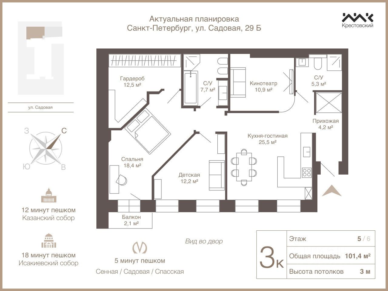 Продуманная планировка включает в себя: o Светлую кухню-гостиную (25.5 м²): Сердце дома для приема гостей и семейных вечеров. o Уединенную спальню (18.4 м²) + вместительная гардеробная (12.5 м²): Ваш личный уголок спокойствия и порядка. o Отдельную комнату (10.9 м²): Готова стать уютным домашним кинотеатром, кабинетом или гостевой комнатой. o Детская/кабинет (12.2 м²): Универсальное пространство, легко адаптируемое под ваши нужды. o Два отдельных санузла: Удобство для всей семьи или гостей. o Атмосферный балкон: идеальное место для утреннего кофе