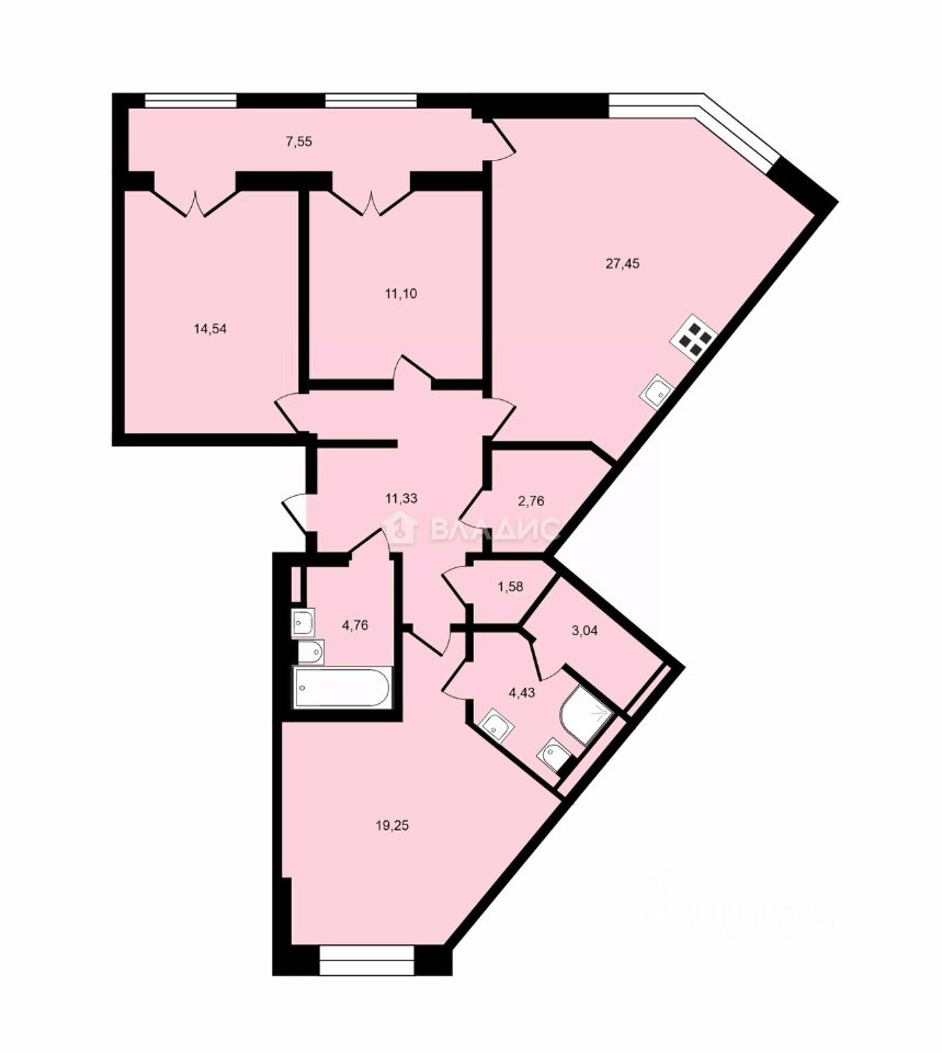 Общая площадь квартиры составляет 98,9 кв. м, из которых 44,89 кв. м приходится на жилую площадь. Просторная кухня-гостиная площадью 27,45 кв. м станет местом для семейных ужинов и дружеских встреч.