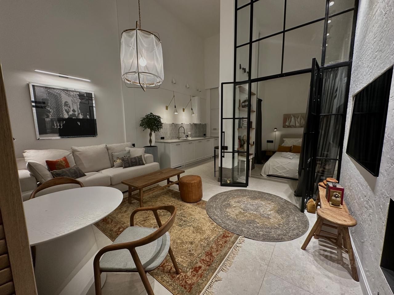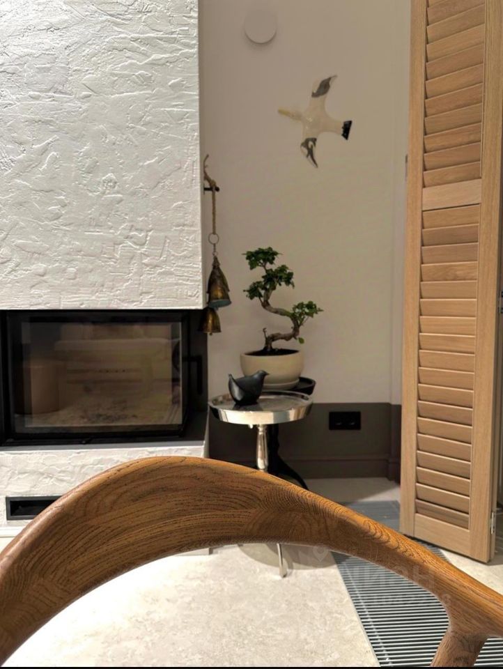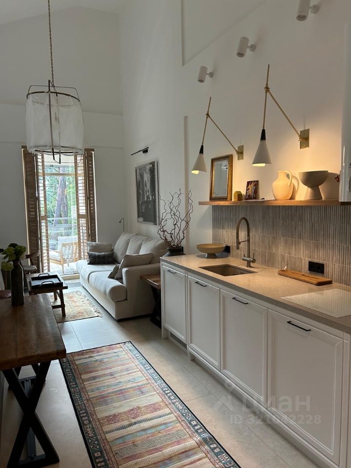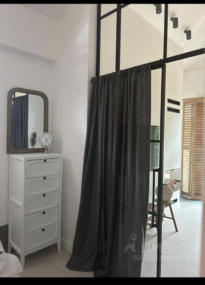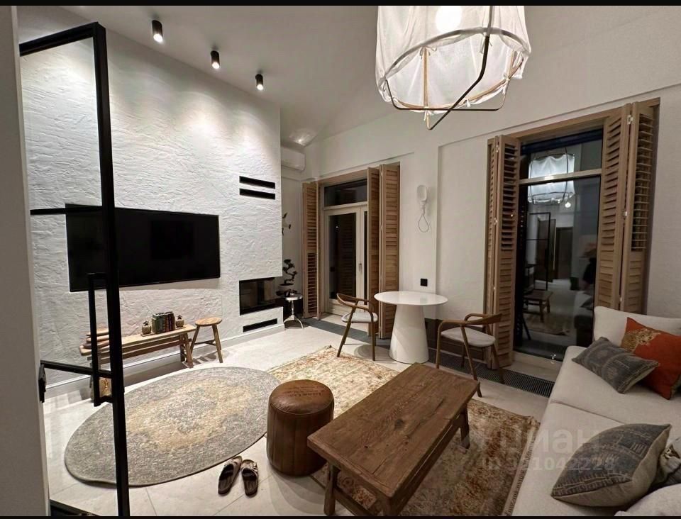 Планировка апартамента: -одна спальня с двухспальной кроватью , -кухня гостиная с диваном и камином, -совмещенный сан узел, -прихожая, -видовая лоджия площадью 12 м2 с безрамным остеклением. Высота потолка - 4-5,5 метров. Новая мебель, техника, сантехника премиального уровня.