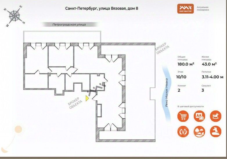 Комплекс включает в себя единую закрытую благоустроенную зону с собственным прибрежным променадом и причалом для яхт( у нас есть место для яхты) просторный паркинг с собственной мойкой для машин, спа-центр с бассейном и джакузи, финскую сауну и турецкий хамам, детский сад, салон красоты, клинику, продуктовый магазин и пекарню, банк, аптеку, горничный сервис, лобби-бар (где можно провести деловую встречу и т.п.) и два видовых ресторана с террасами. Пентхаус уникален своими видовыми характеристиками и зимним садом . Квартира 180 кв .м. располагается на 10 этаже имеет балкон и зимний сад 60 кв.м. с выходом на крышу и видом на изгибы р.Малой Невки . Комплекс находится на закрытой территории под видео наблюдением. Всё, что происходит в публичных зонах: во дворах, парадных, паркинге — фиксируют видеокамеры и контролируют специалисты службы безопасности Все документы к сделки готовы. Один собственник. Предлагаем ПРЕМИАЛЬНОЕ обслуживание для требовательных клиентов. Оперативно организуем просмотр, предоставим полную информацию по объекту.