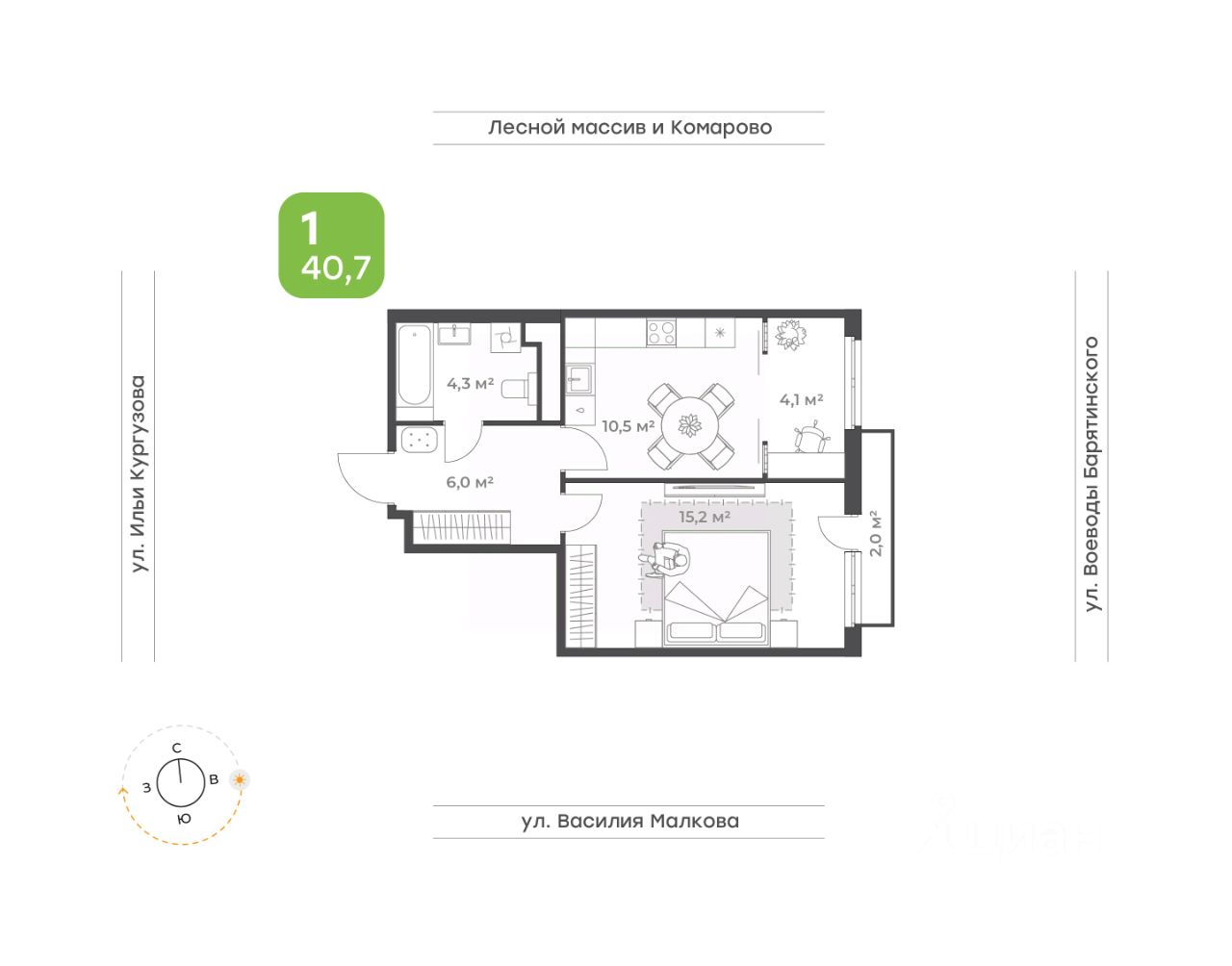 Однокомнатная квартира с видом на современный микрорайон Комарово-парк
