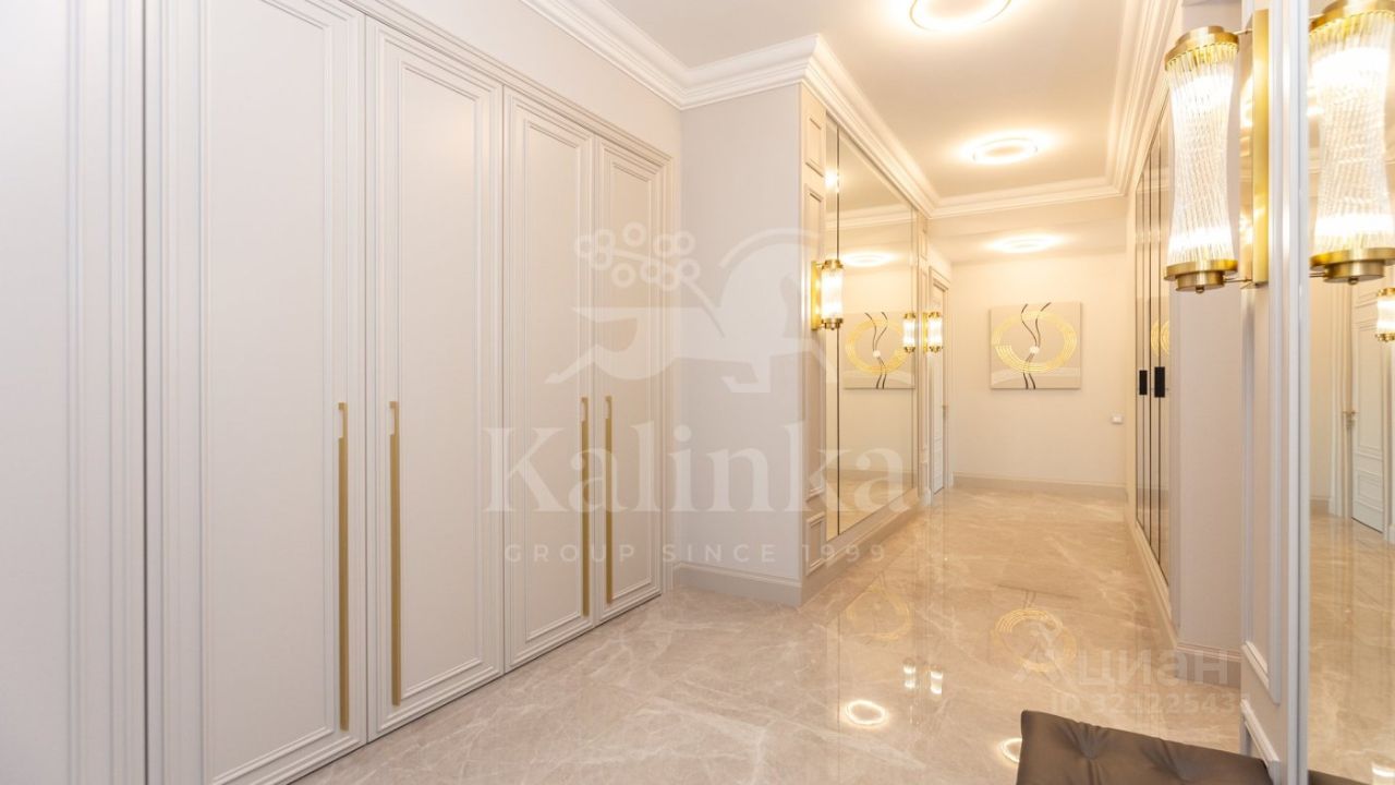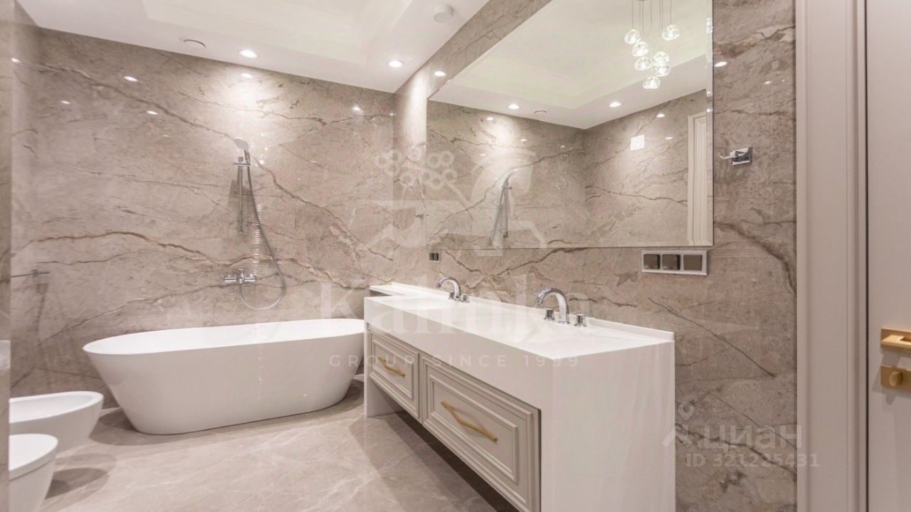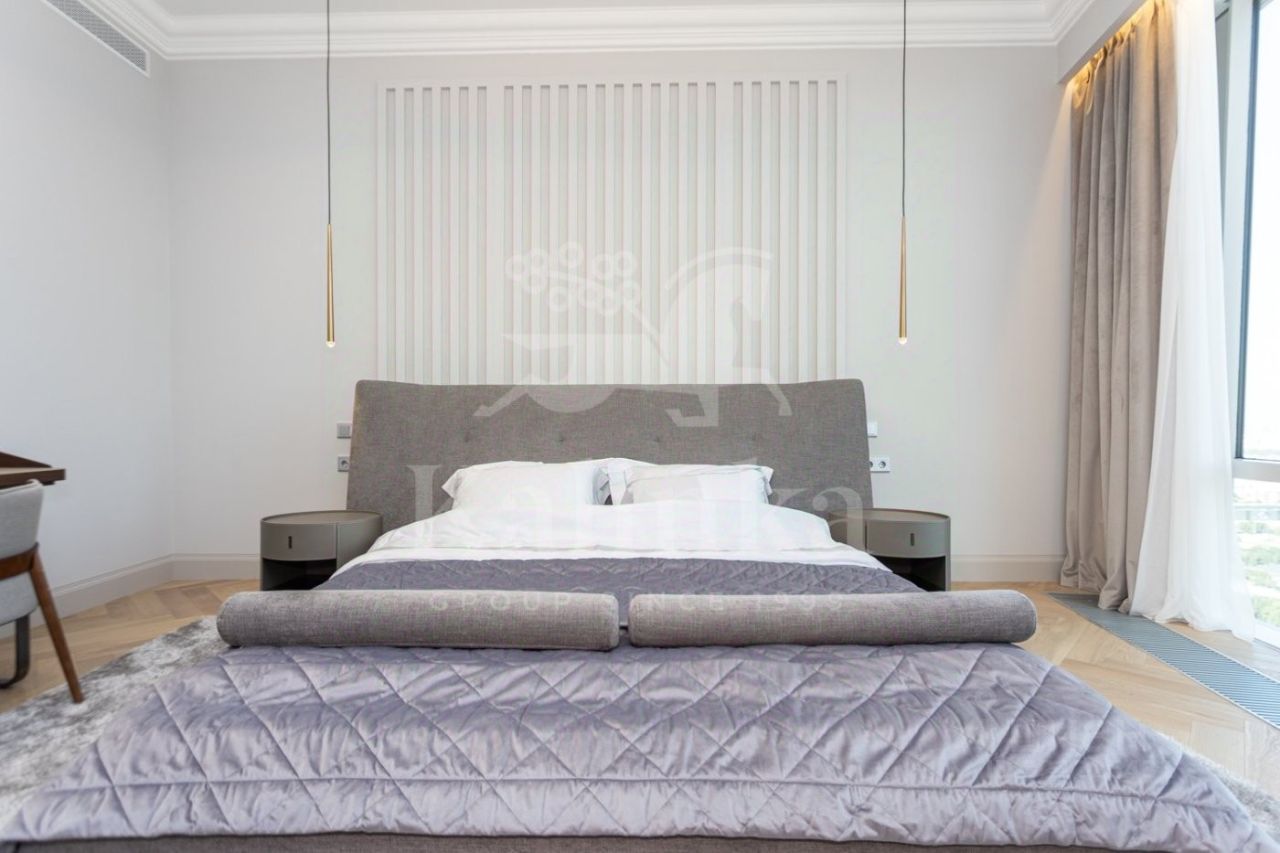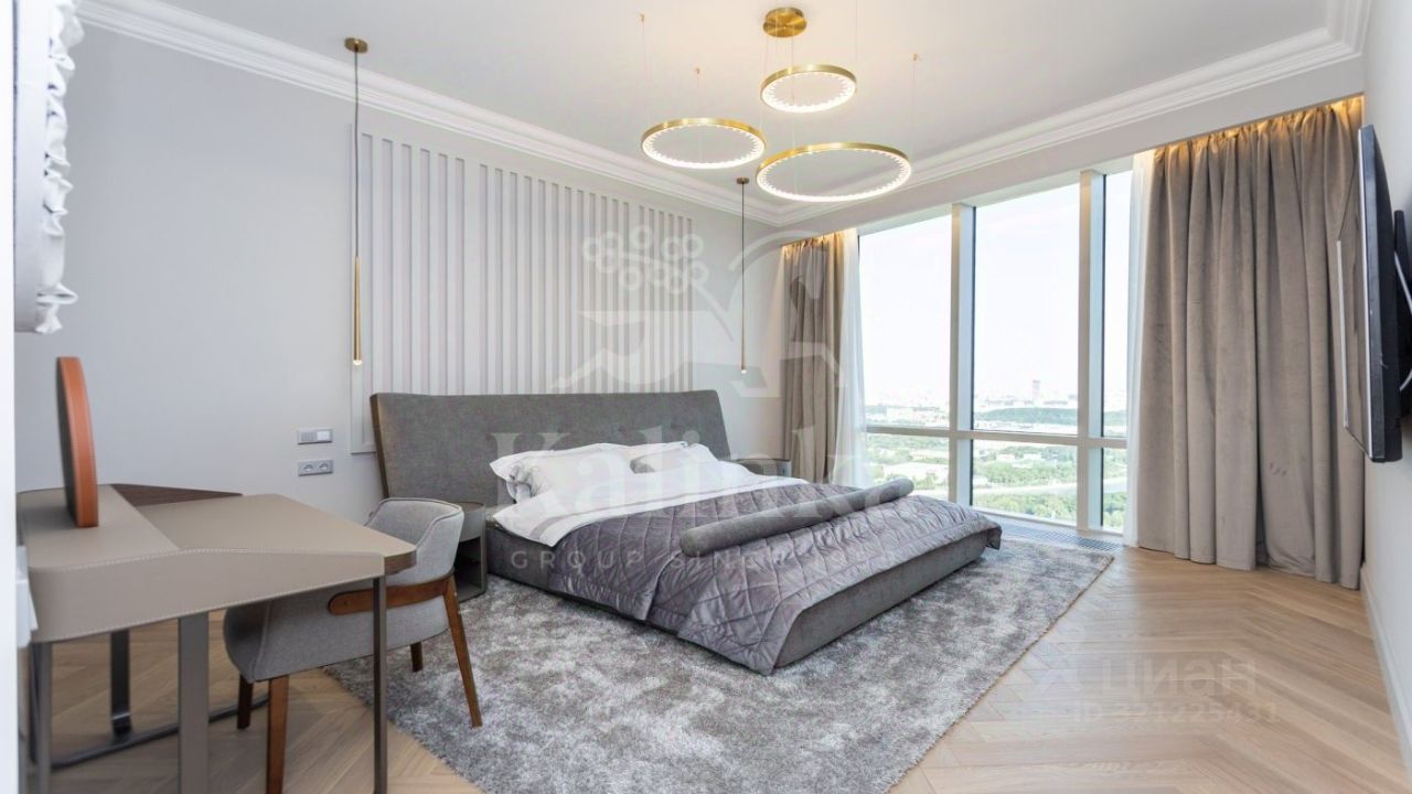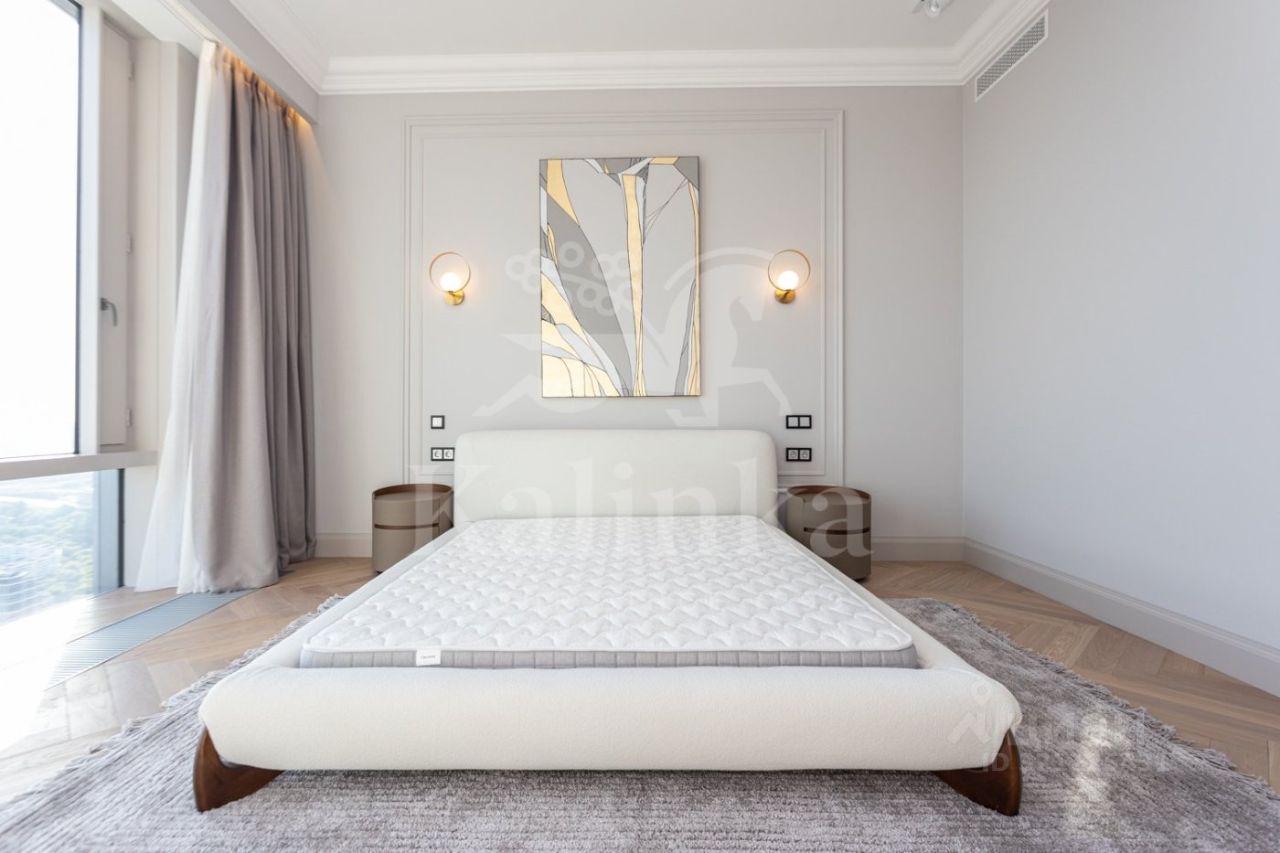 Планировка квартиры включает кухню-гостиную, две просторные мастер-спальни с индивидуальными ванными комнатами и гардеробными, две дополнительные спальни, два санузла, постирочную и прихожую. Высокие панорамные окна наполняют комнаты ярким естественным светом. Выполнен качественный новый ремонт с использованием дорогих материалов.