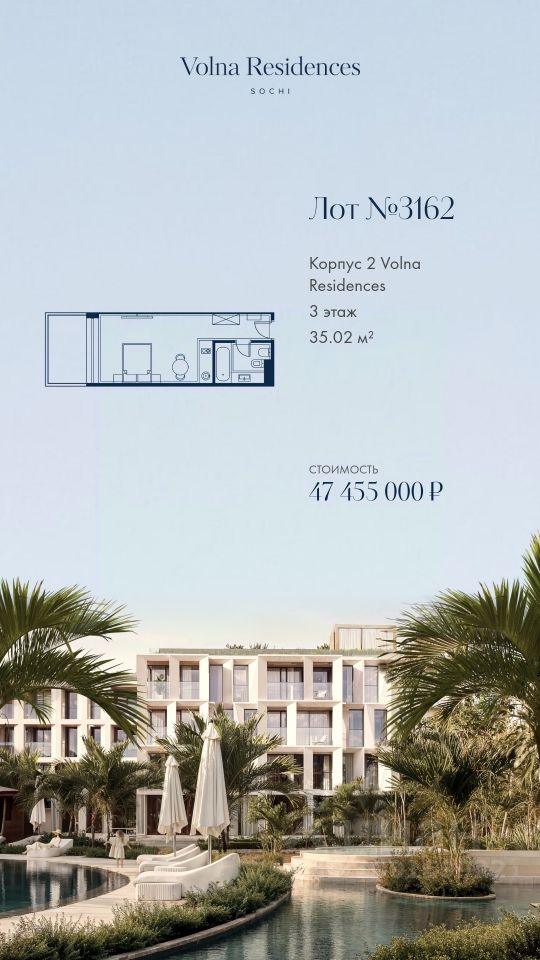Продаётся 1-комнатная квартира в строящемся доме (Дом 2), срок сдачи: II-кв. 2028, общей площадью 35.02 кв.м., на 2 этаже. Volna Residence - это комплекс для жизни на территории комплекса Volna, объединённый с отелем общей концепцией и инфраструктурой. 3 малоэтажных корпуса на 520 номеров расположены на первой береговой линии и имеют собственный бассейн.