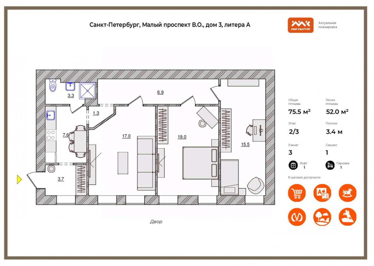Объект площадью в 75,5 м2 состоит из 3 изолированных комнат, кухни, совмещенного санузла и прихожей зоны. Высокие потолки в 3,4 м! В парадной проживают только 2 семьи. Окна квартиры выходят в тихий, аккуратный двор. Прекрасная звукоизоляция. Капитальных стен в квартире нет, подходит для перепланировок. Идеальный вариант под ремонт.