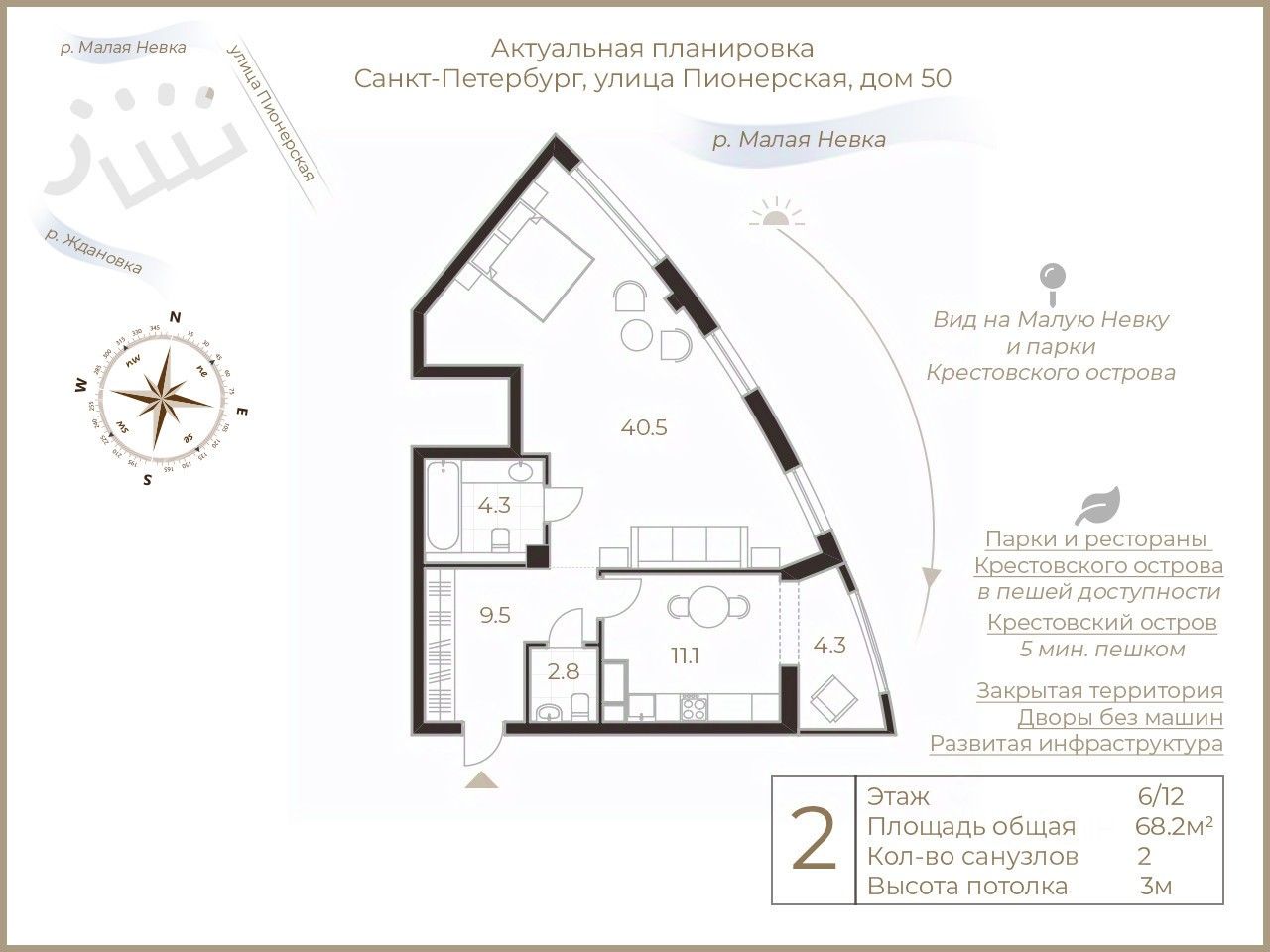 Район престижный, укомплектован социальной и коммерческой инфраструктурой. Большой выбор мест для прогулок, набережная и парки Крестовского в пешей доступности. Для удобства жителей в жилом комплексе имеются частный детский сад и развивающий клуб, салон красоты, фитнес-центр. По Ждановской набережной можно быстро выехать на проспект Добролюбова, откуда вы быстро попадете на стрелку Васильевского и в центральные районы города.