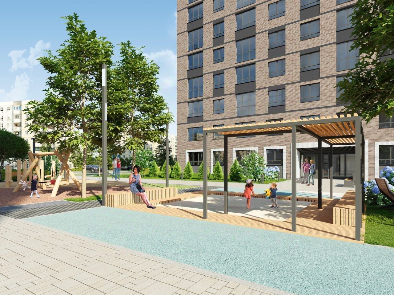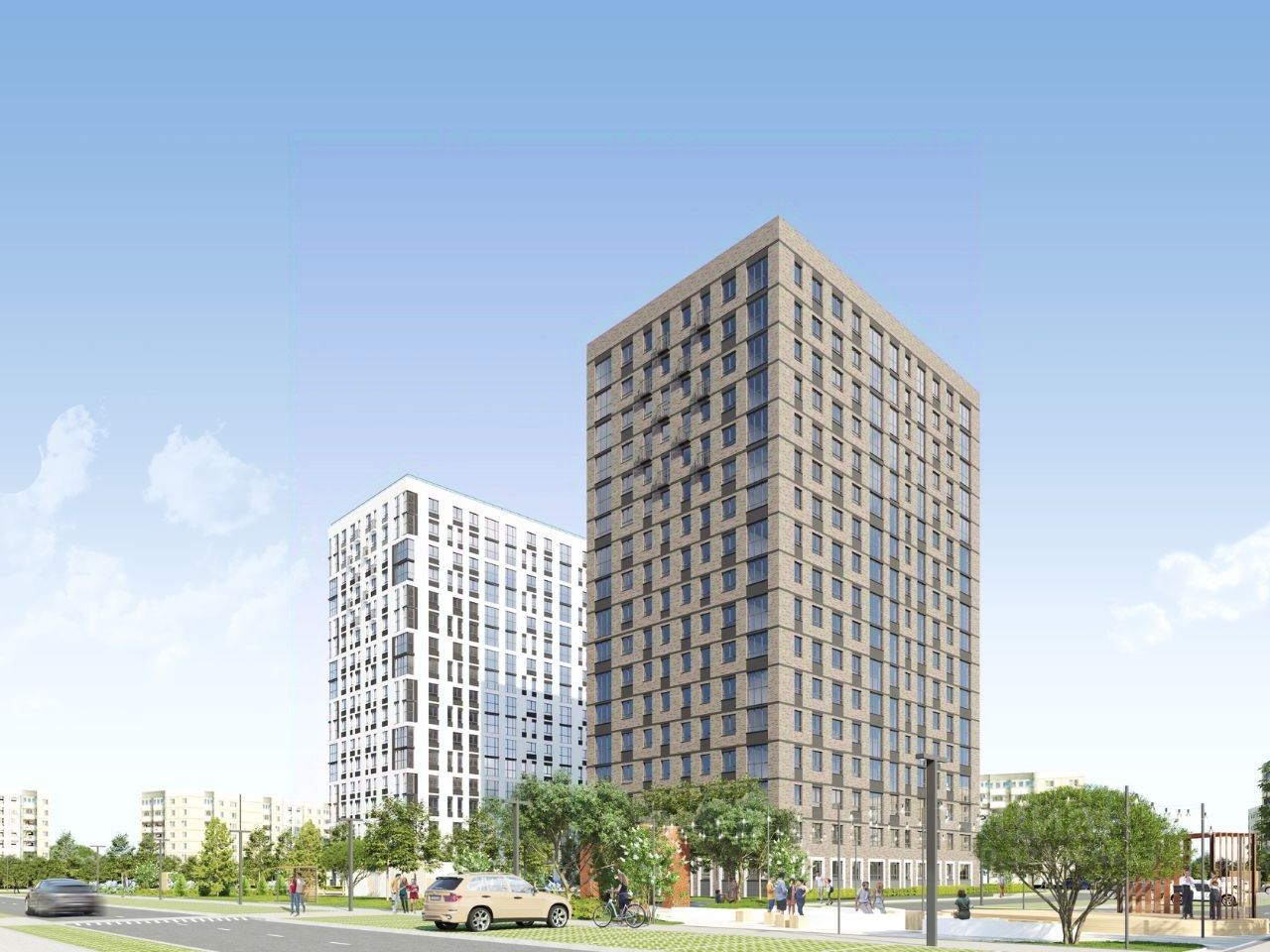 В проекте жилого комплекса мы предусмотрели большое количество детских и спортивных площадок, зеленую аллею для прогулок с элементами ландшафтного дизайна, широкие дворовые проезды, новый, расширенный пакет системы ''Умный дом''.