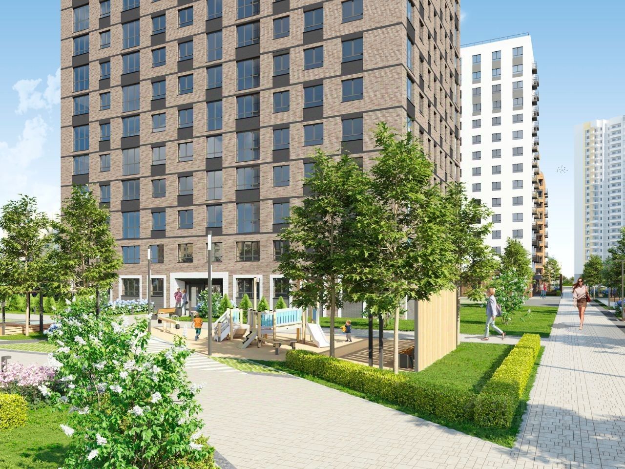 В проекте жилого комплекса мы предусмотрели большое количество детских и спортивных площадок, зеленую аллею для прогулок с элементами ландшафтного дизайна, широкие дворовые проезды, новый, расширенный пакет системы ''Умный дом''.