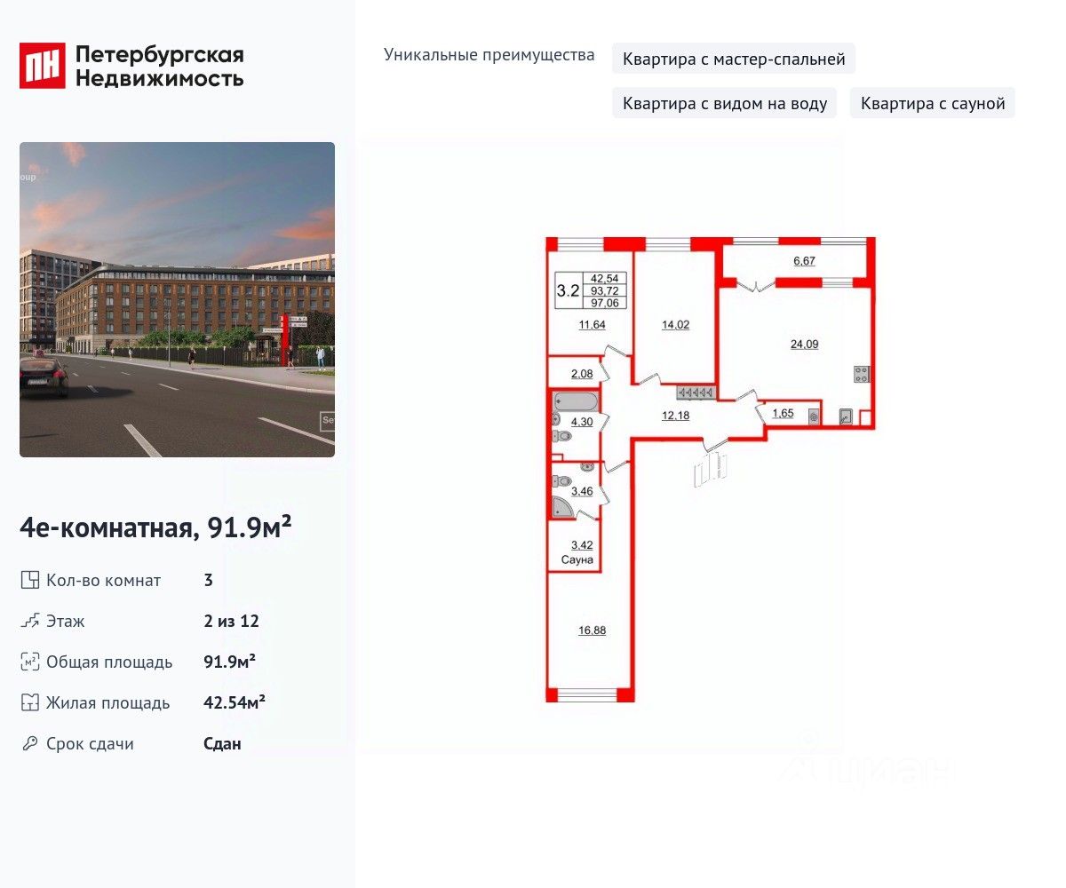 Уникальная, функциональная европланировка, большая кухня-гостиная 24.09 м², просторная прихожая 12.18 м². Общая площадь квартиры - 91.9 м², жилая 42.54 м², высота потолка 2.76 м.