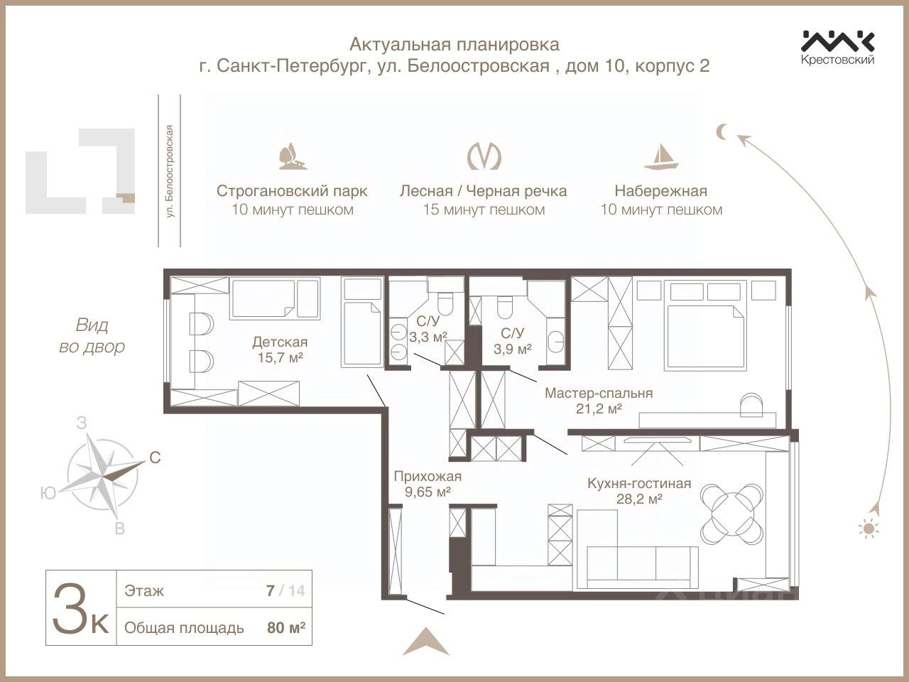 Арт. 114363499 Большие окна, качественный ремонт, грамотная планировка и богатая инфраструктура — эта квартира станет идеальным решением для тех, кто хочет переехать в готовый дом и сразу начать наслаждаться комфортной жизнью в престижном районе. Квартира находится на 7 этаже. Мастер-спальня с собственной гардеробной и ванной создаёт приватную зону отдыха, дополнительная комната идеально подойдёт для детской или домашнего кабинета. А просторная кухня-гостиная с удобными системами хранения станет сердцем дома, где приятно собираться всей семьёй. Окна на две стороны дарят квартире особую атмосферу — естественный свет наполняет пространство с утра до вечера, создавая ощущение воздушности и визуально расширяя каждую комнату. Качественный новый ремонт выполнен с использованием современных отделочных материалов и сантехники. Инженерные системы нового поколения обеспечивают надёжность и экономичность эксплуатации. В квартире никто не жил, всё готово для комфортного заселения. ЖК ''ЦДС Чёрная Речка'' предлагает жильцам насыщенные инфраструктуру. На территории есть магазины, кафе и салоны красоты, что избавляют от необходимости далеко ехать за повседневными услугами. Также есть подземный паркинг, круглосуточная охрана и видеонаблюдение. Станция метро ''Лесная'' находится в шаговой доступности, а прямо через мост открывается вся развитая инфраструктура Петроградки с её зелёными парками, ресторанами и культурными объектами. Звоните, чтобы узнать детали и договориться о просмотре!