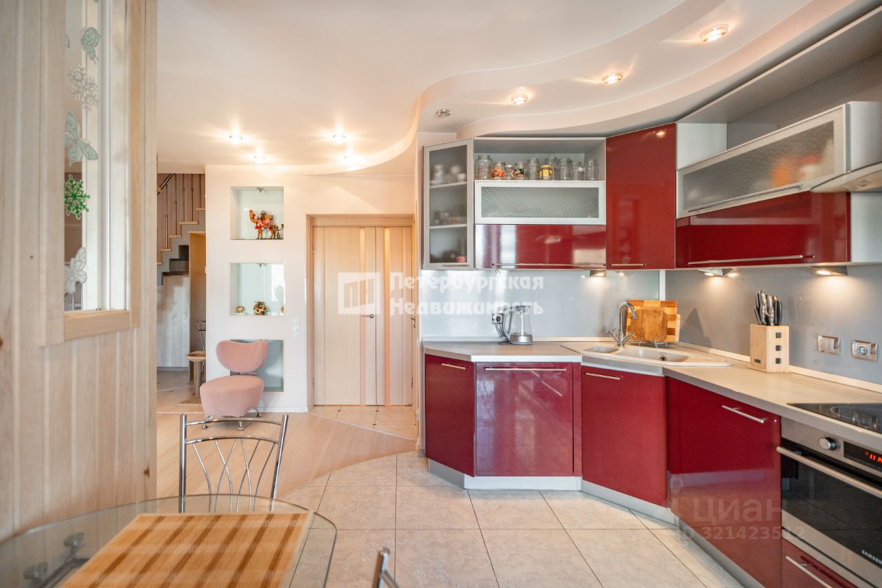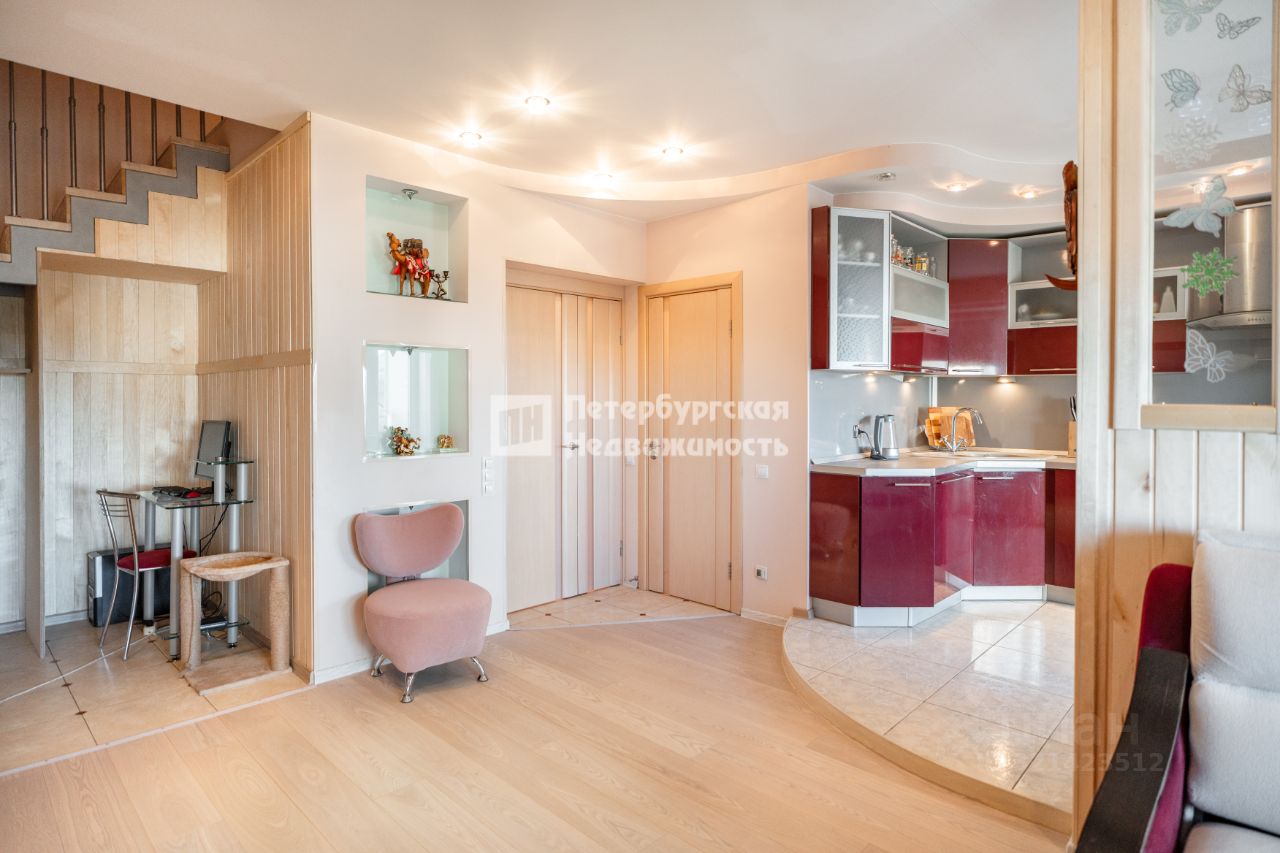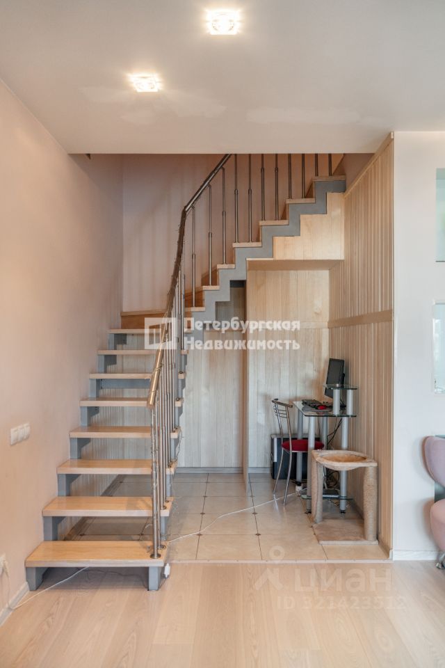 На первом уровне квартиры расположена вместительная закрытая зона гардеробной, просторная кухня-гостиная 32 кв м с выходом на лоджию, оборудована зона для работы с ПК. На втором уровне - две спальни, просторный санузел с ванной. Из санузла есть оборудованный выход в помещение для хранения личных вещей.