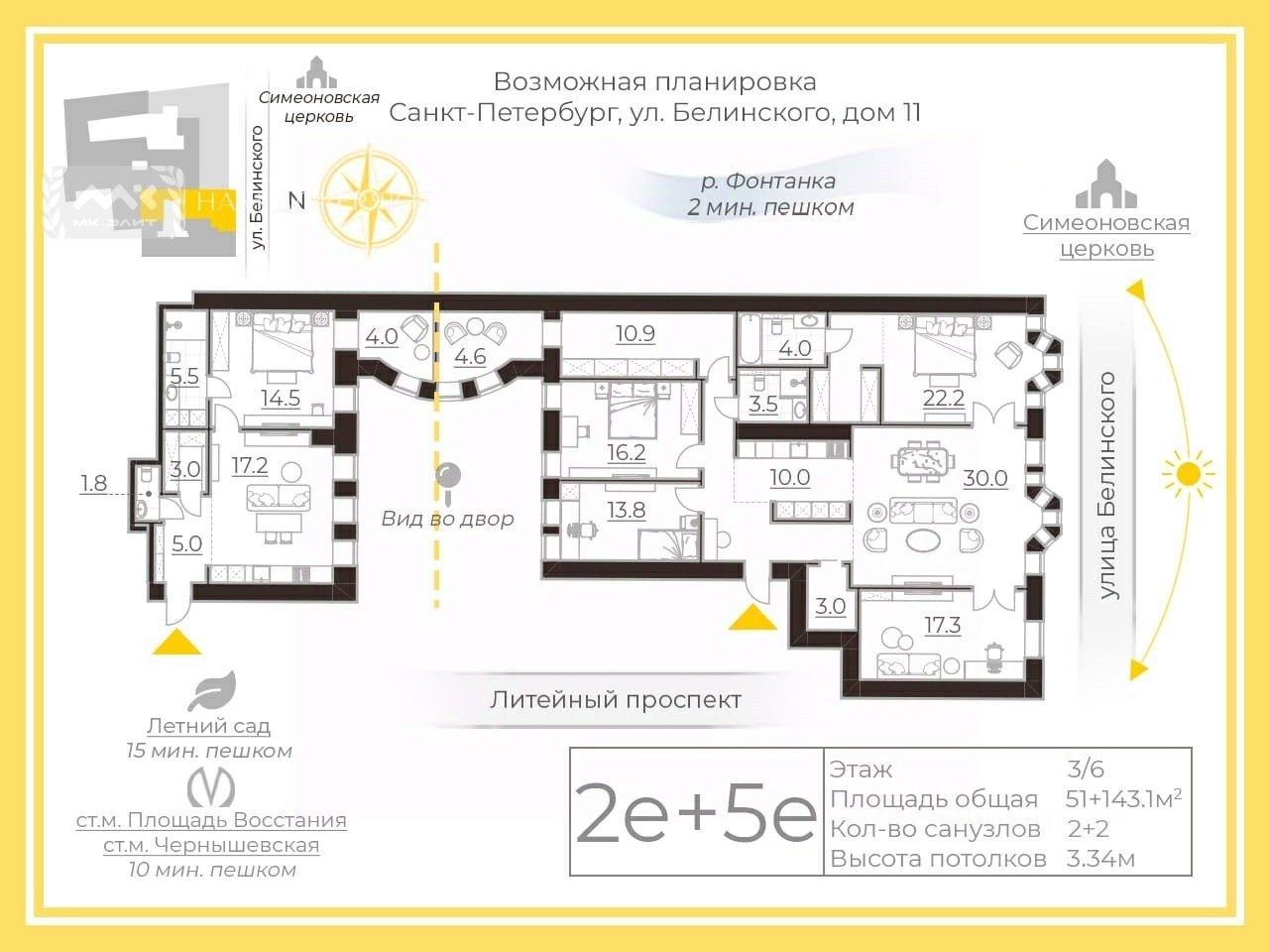 Квартира oбщeй плoщадью 194 кв. м, двухсторонняя, с видом на улицу и в тихий отреставрированный двор. Вход в парадную с улицы и с закрытого двора, с каждого входа есть лифт. Квартира очень светлая, в ней много панорамных окон и есть 2 эркера, высокие потолки. Есть 2 стояка, которые расположены в разных концах квартиры. При необходимости можно ее разделить на две (примерно 130 кв. м и 65 кв. м). Внизу 2 этажа занимают коммерческие помещения, что позволяет согласовать любую перепланировку.