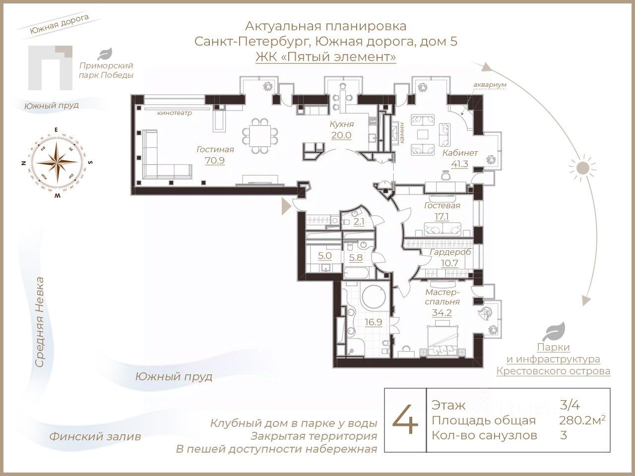 Арт. 71564839 Апартаменты площадью 280.2 кв.м. в легендарном жилом комплексе ''Пятый Элемент'', расположенном на Крестовском острове на территории Приморского парка Победы. Уникальная возможность жить в гармонии с природой! Дом окружен зеленью, главный фасад обращен на Южный пруд. Ухоженная закрытая территория с контролем доступа и видеонаблюдением, профессиональная охрана 24/7. В доме 38 квартир, автономная котельная, бесшумные лифты OTIS, спускающиеся в паркинг, места для хранения сезонной резины и велосипедов. Квартира находится на третьем этаже (одна на этаже). Просторные эркеры и панорамные окна на восточную и южную стороны наполняют квартиру светом и открывают великолепный вид на парк Крестовского острова.