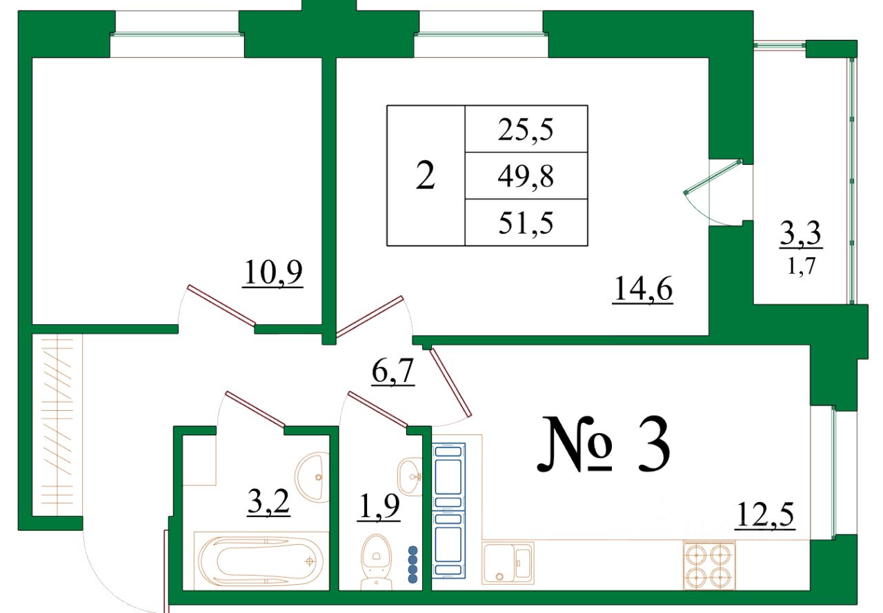 Общая площадь51,5 м2