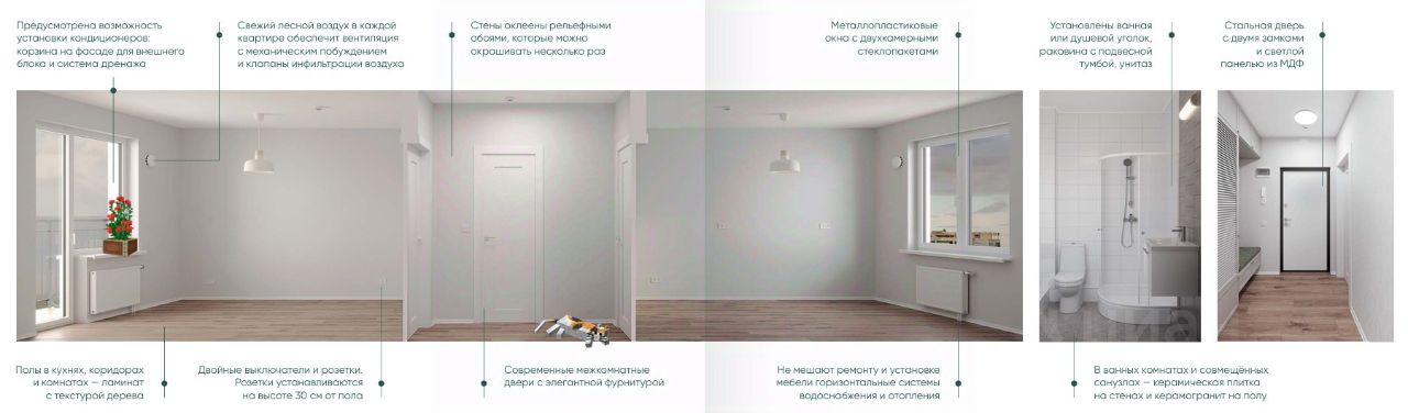 Квартира с чистовой отделкой Comfort Stone, в светлых тонах, из современных экологичных материалов: ламинированные межкомнатные двери, двухкамерные стеклопакеты, флизелиновые обои, качественный матовый ламинат с фактурой дерева, керамическая плитка. На первом этаже есть колясочная. Система ''Умный дом'', двор без машин. Круглосуточное видеонаблюдение, прогулочные зоны без автомобилей.