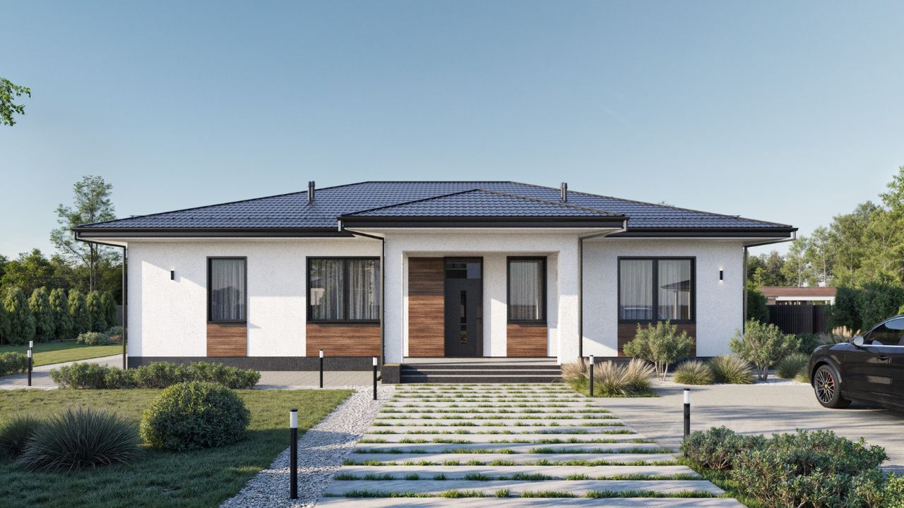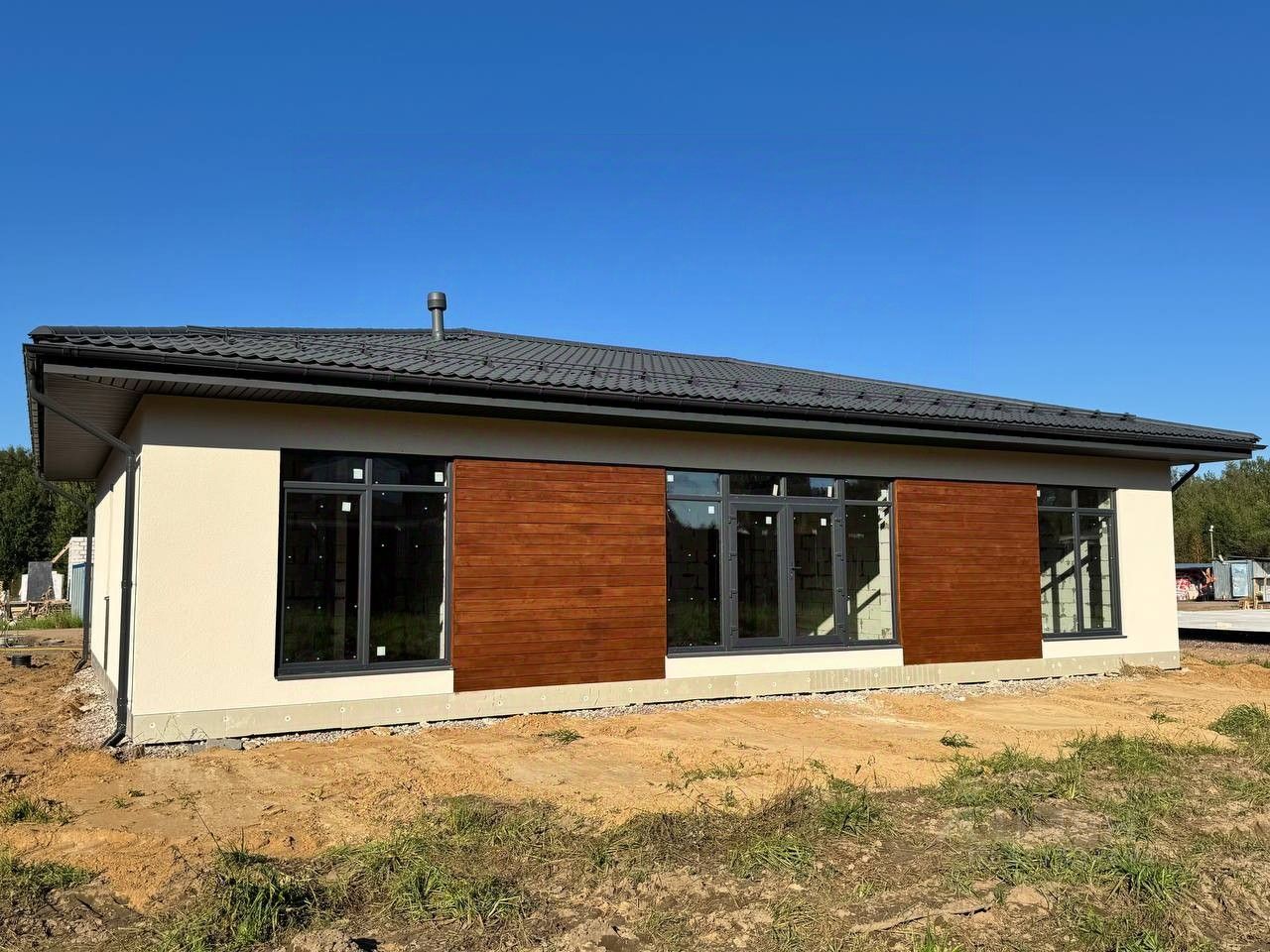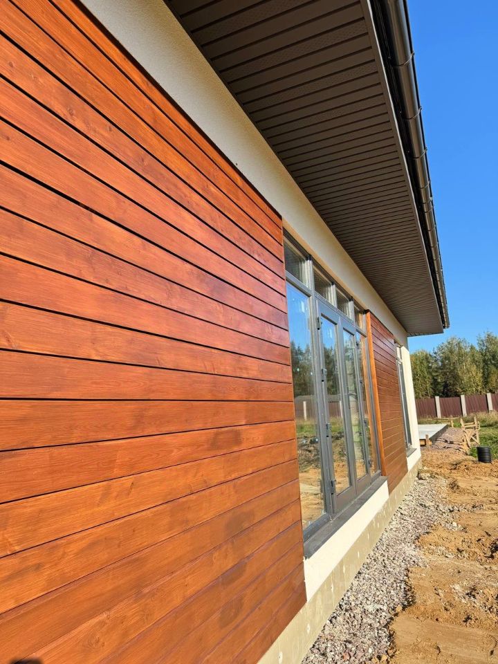 Дом 167 м2 из газобетона 400 мм, на фундаментной плите 300 мм. Фасад: штукатурка и планкен.