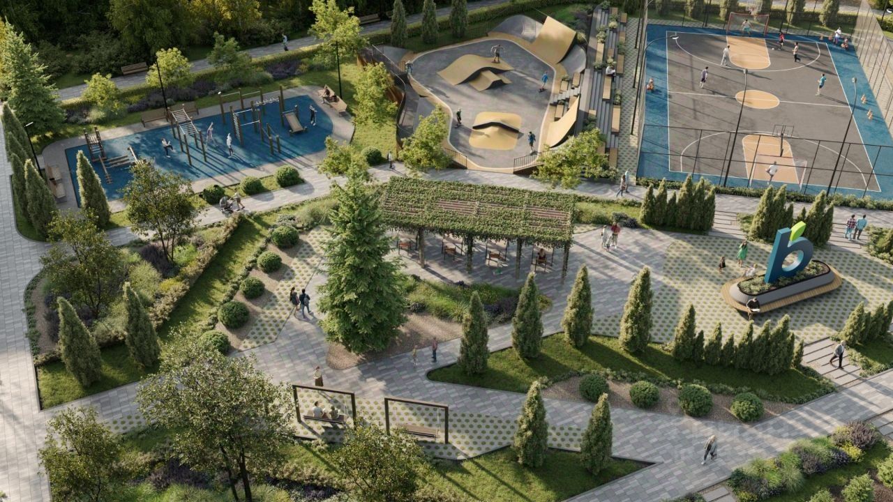 Территория закрыта от машин, есть детские и спортивные площадки, скейт-парк и теннисный корт.