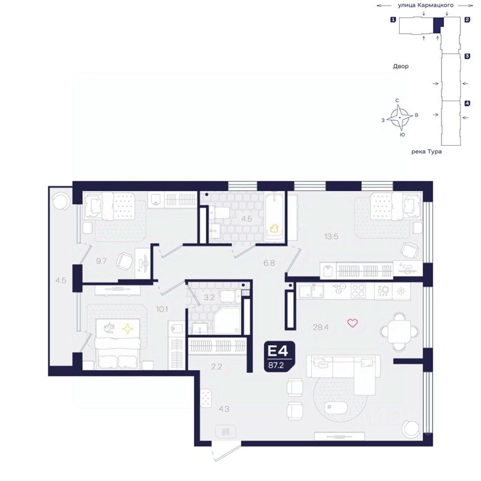 Эта четырехкомнатная квартира с окнами, выходящими на две стороны, идеально сочетает в себе уединение и общественное пространство, обеспечивая комфортное проживание для всей семьи.