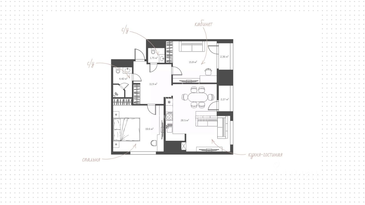 Планировка включает большую гостиную, спальню, кабинет, который можно обустроить как детскую комнату, два санузла, холл. В доме имеется паркинг, два машиноместа в собственности.