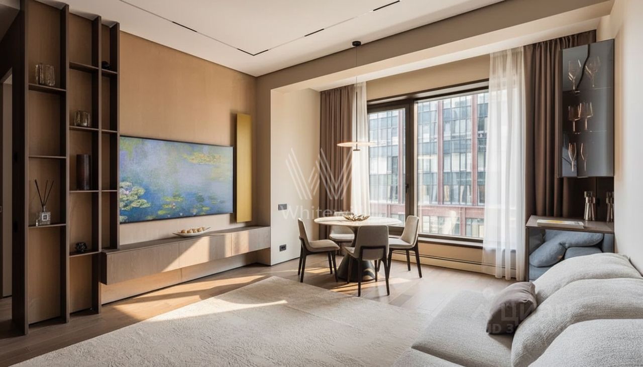 Просторная квартира с двумя спальнями общей площадью 100 м² в комплексе премиум-класса ''Садовые кварталы'' на 8-м этаже. Выполнена дизайнерская отделка в современном стиле. В оформлении использованы натуральный мрамор и шпон. Квартира укомплектована итальянской мебелью и бытовой техникой Gaggenau.