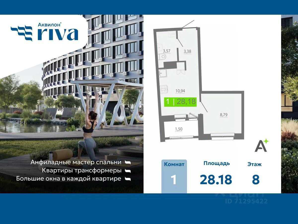 Просторная 1-комн. квартира в ЖК ''Аквилон RIVA'' на 8 этаже. Квартира без отделки, после получения ключей можно делать ремонт. Общая площадь: 28.18 кв.м., площадь просторной кухни-столовой: 10.94 кв.м. Высота потолков 2.73 м.