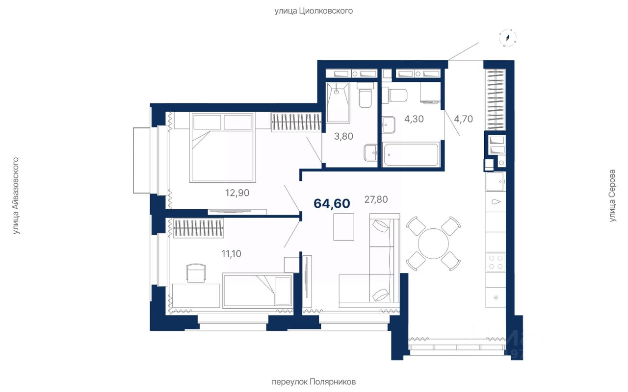 Комплекс представляет собой жилую экосистему Комфорт+ класса: многосекционный дом, закрытая территория, паркинг и коммерческая инфраструктура внутри комплекса.