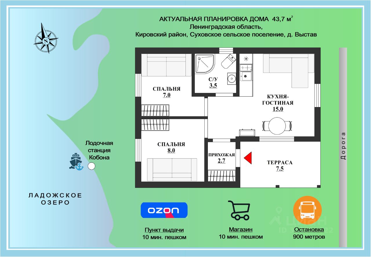 Рядом с домом есть продуктовый магазин, пункт выдачи Озон, школа, в 15 минутах на Ладоге есть лодочная станция, рядом с домом грибные и ягодные места, от СПБ до дома асфальтированная дорога.