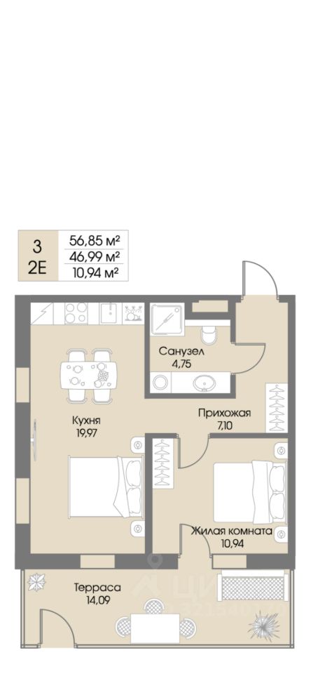- Общая площадь 56кв. м.