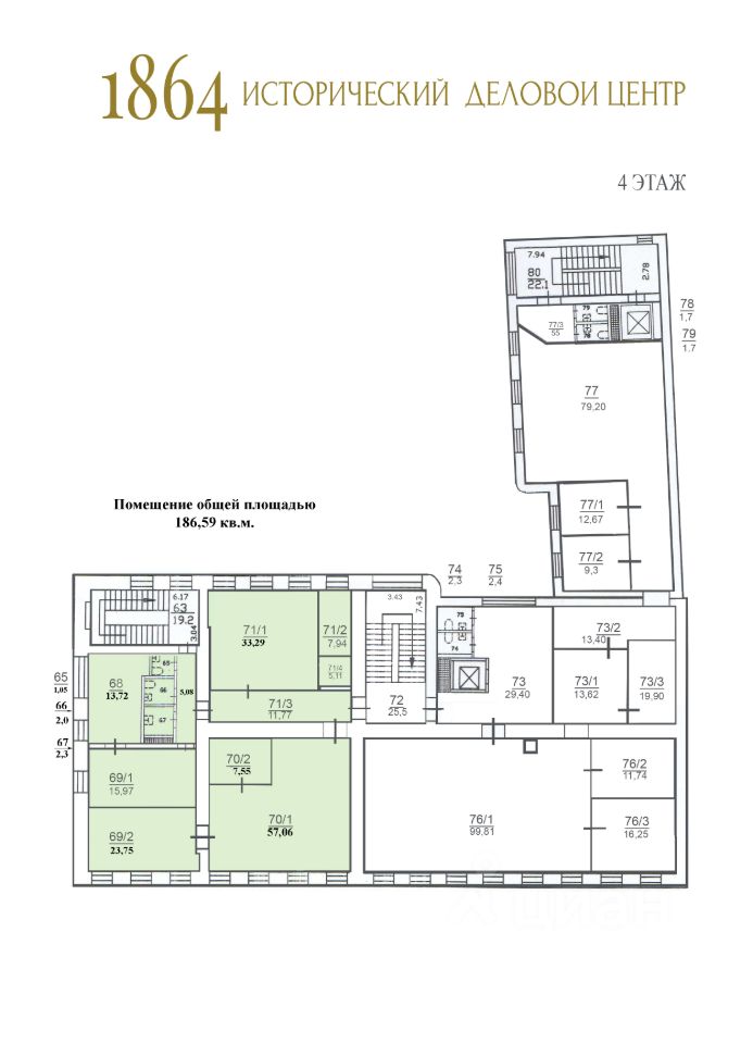 Площадь помещения 186 кв.м, 4-й этаж, высота потолков 3 м.