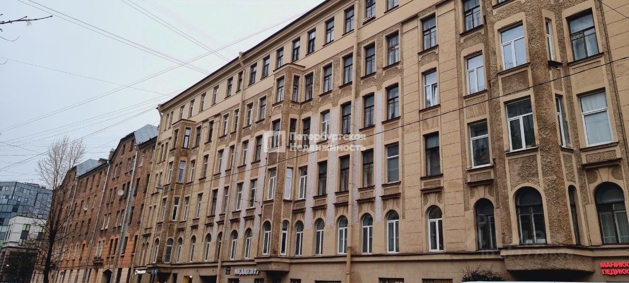 Красивый дом 1912 года постройки. Вход в парадную с Малого проспекта Петроградской стороны (не со двора). Лифт до пятого этажа, потом нужно подняться на шестой этаж по лестнице.