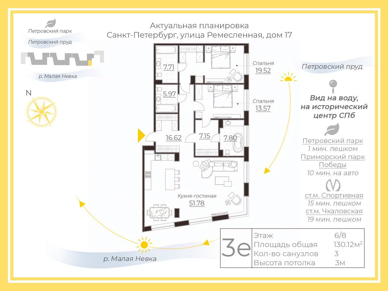 Это одна из 8 резиденций корпуса Residence, которые смотрят именно в сторону Центрального и Василеостровского района. Квартира общей площадью 130м2 расположена на 6 этаже тем самым она возвышается над соседним домом, её видовым характеристикам ничего не мешает и без преувеличения является ''квартирой шкатулкой'' чьи характеристики превышают и дополняют и без того по настоящему шикарный Жилой Комплекс со всеми его преимуществами и так обо всём по порядку: