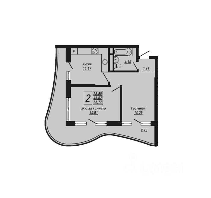 Общая площадь55,77 м2