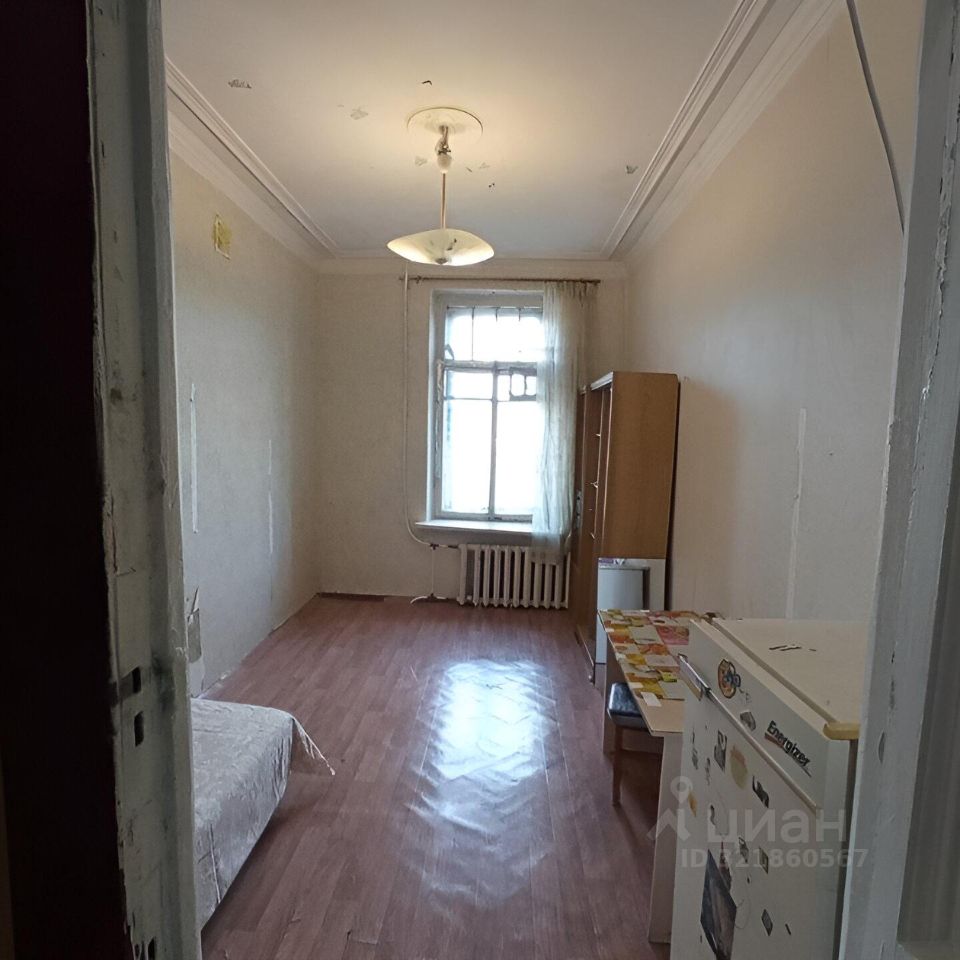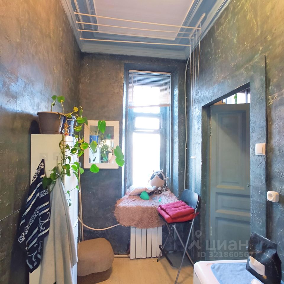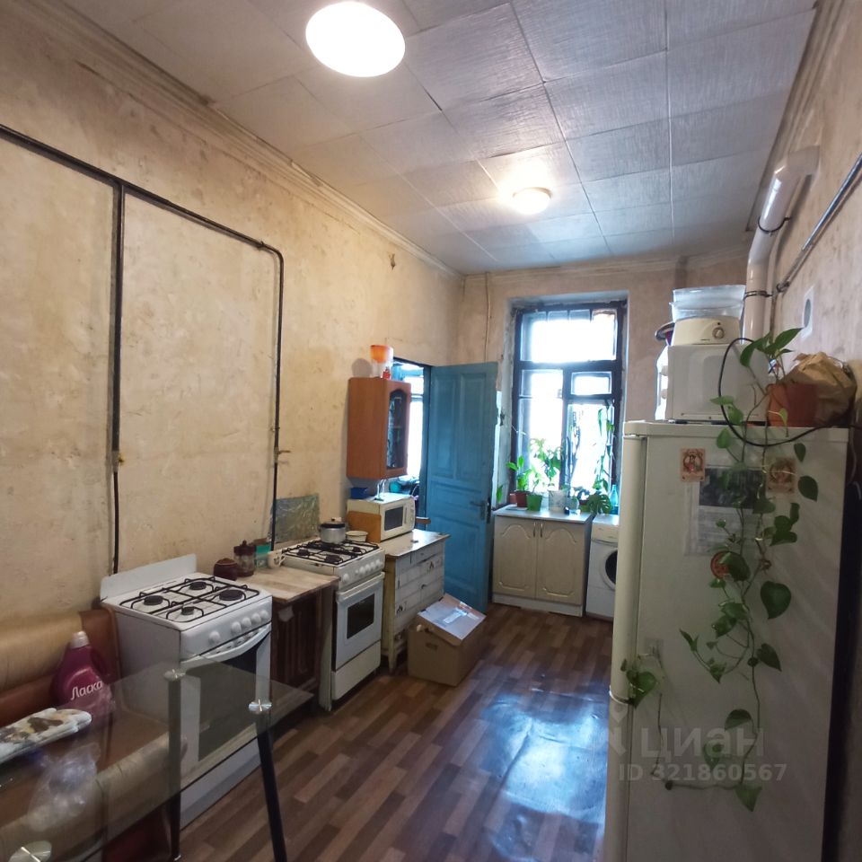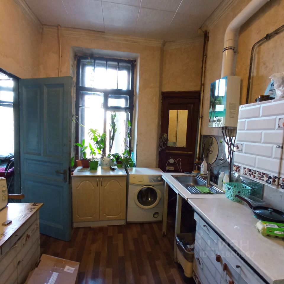 Комната 13.4 метров квадратных, прямоугольной формы, в 5-ти комнатной квартире, окно выходит во двор. Квартира двухсторонняя, второй дом от Большого проспекта ПС. Вход парадный, лестница парадная, установлен домофон.Дом 5-6+мансарда этажей. Окна квартиры выходят на улицу, Владимирский собор и во двор. Лифта нет. Кухня просторная, 12,7 м2, две газовые плиты, газовая колонка, также есть место для стиральной машины. К кухне прилегает комната 8 м2 МОП, имеется выход на чёрную лестницу. Высота помещения 3,23 метра. Квартира малонаселенная, 5 собственников.