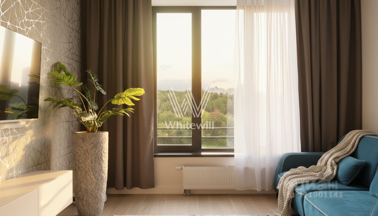 Планировка включает кухню-гостиную с обеденной зоной, две спальни, две ванные комнаты и холл. Дополнительно предусмотрены места хранения вещей. Благодаря широкоформатному остеклению пространство наполнено естественным светом и теплом, открываются виды на Матвеевский лес и проспект Генерала Дорохова.