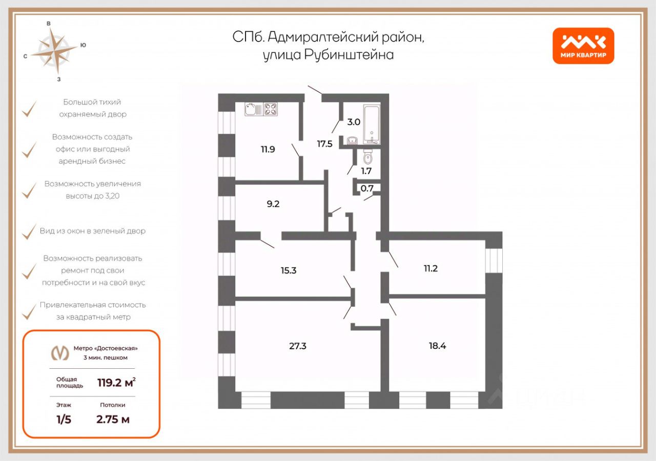 продам 5-к, Рубинштейна, 1123 998 000 ₽