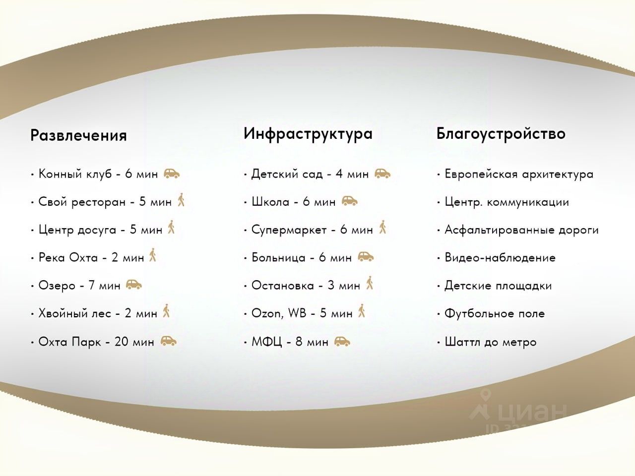 ПРЕИМУЩЕСТВА ПОСЕЛКА: • Единый архитектурный стиль • Инфраструктура для взрослых и детей • Центральные коммуникации • КПП с охраной 24/7 • Видео-наблюдение • УК в приложении • Асфальт освещение дорог парковки • Свой шаттл с развозкой к метро • Свой ресторан • 20 мин от Метро Парнас • 15 мин до Охта-Парк''