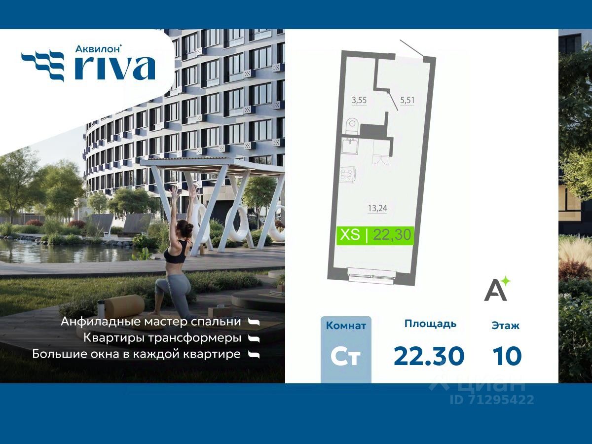 Просторная 1-комн. квартира-студия в ЖК ''Аквилон RIVA'' на 10 этаже. Квартира без отделки, после оформления собственности можно делать ремонт. Общая площадь: 22.3 кв.м., площадь гостиной 13.24 кв.м., из которых 5 кв.м. выделено под кухонную зону. Все окна выходят на одну сторону. В квартире один совмещенный санузел. Высота потолков 2.73 м.