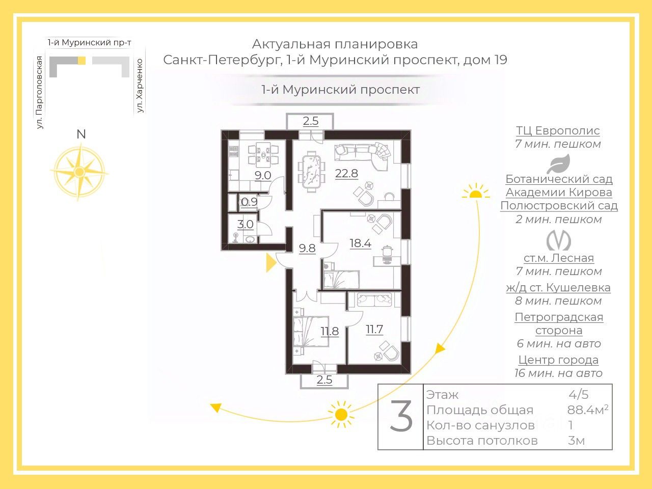 7 минут до станции метро Лесная пешком. 8 минут до Ж/Д станции Кушелевка пешком. 6 минут до Петроградской стороны на транспорте. 16 минут до центра города на транспорте.