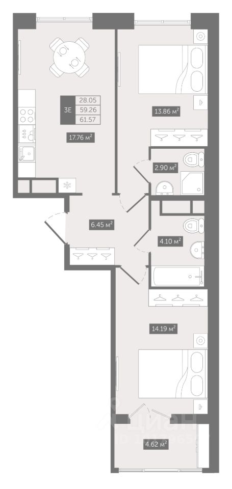 Прямая продажа от застройщика — только в этом месяце. 2-к квартира в клубном доме N8 на 8-м этаже. Общая площадь 61,57. Без отделки.