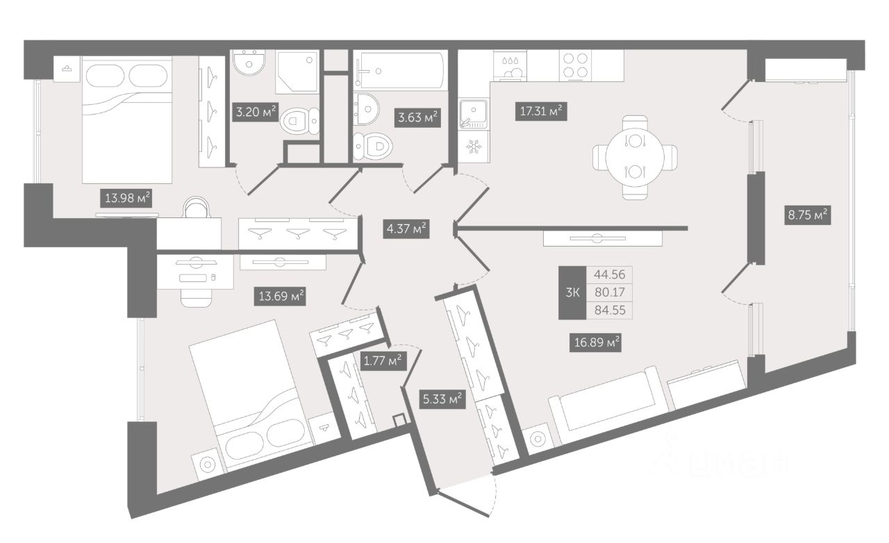 Прямая продажа от застройщика — только в этом месяце. 3-к квартира в клубном доме N8 на 8-м этаже. Общая площадь 84,55. Без отделки.